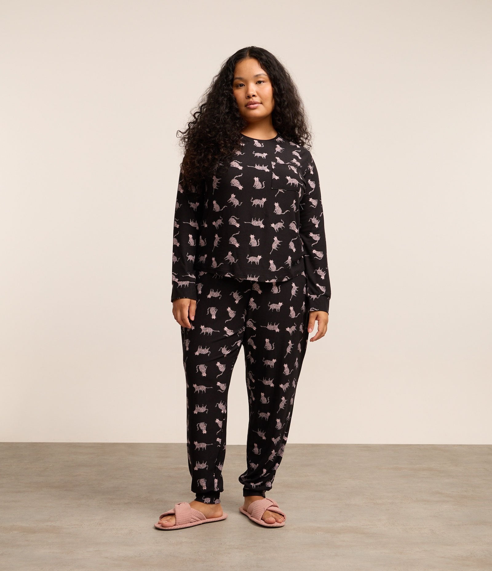 Pijama longo com toque macio e estampa de leopardo, tamanho grande e curvilíneo, preto