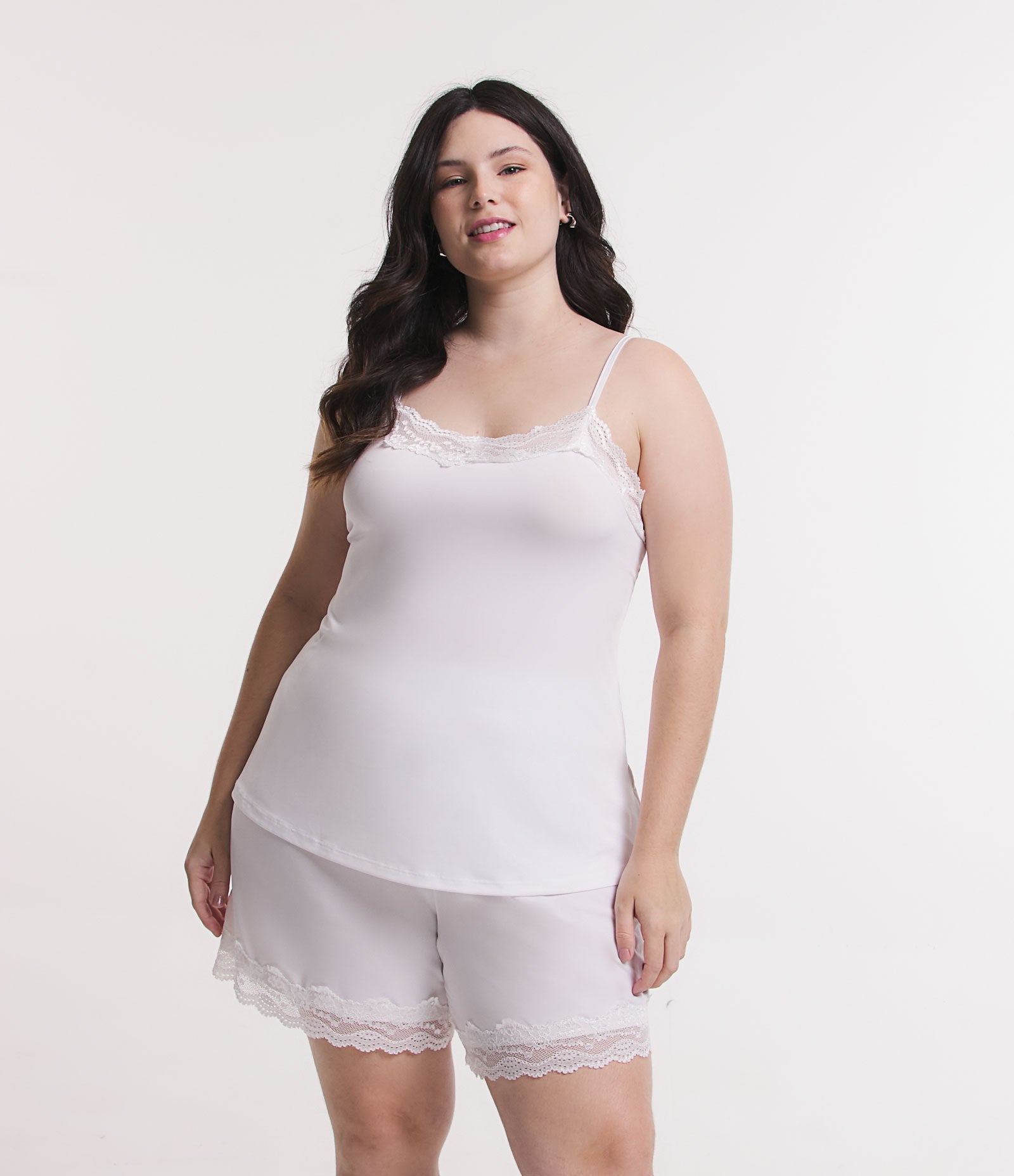 Pijama de boneca curto branco em liganete com detalhes em renda, Curve e Plus Size