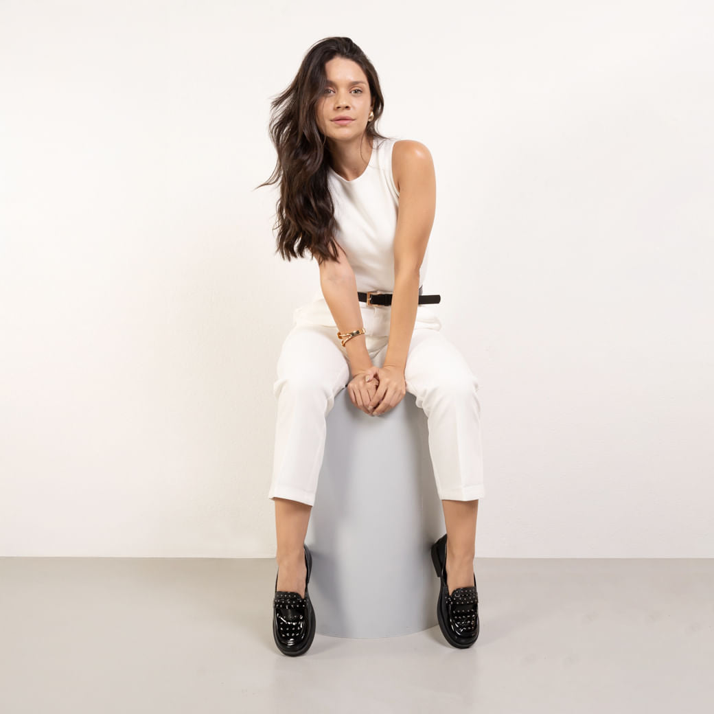 Mocassim feminino de couro preto com pontas da Quiz