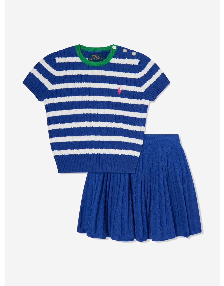 O conjunto de blusa e saia de malha listrada para meninas em azul da Ralph Lauren é a escolha ideal para passeios casuais e uso diário.
