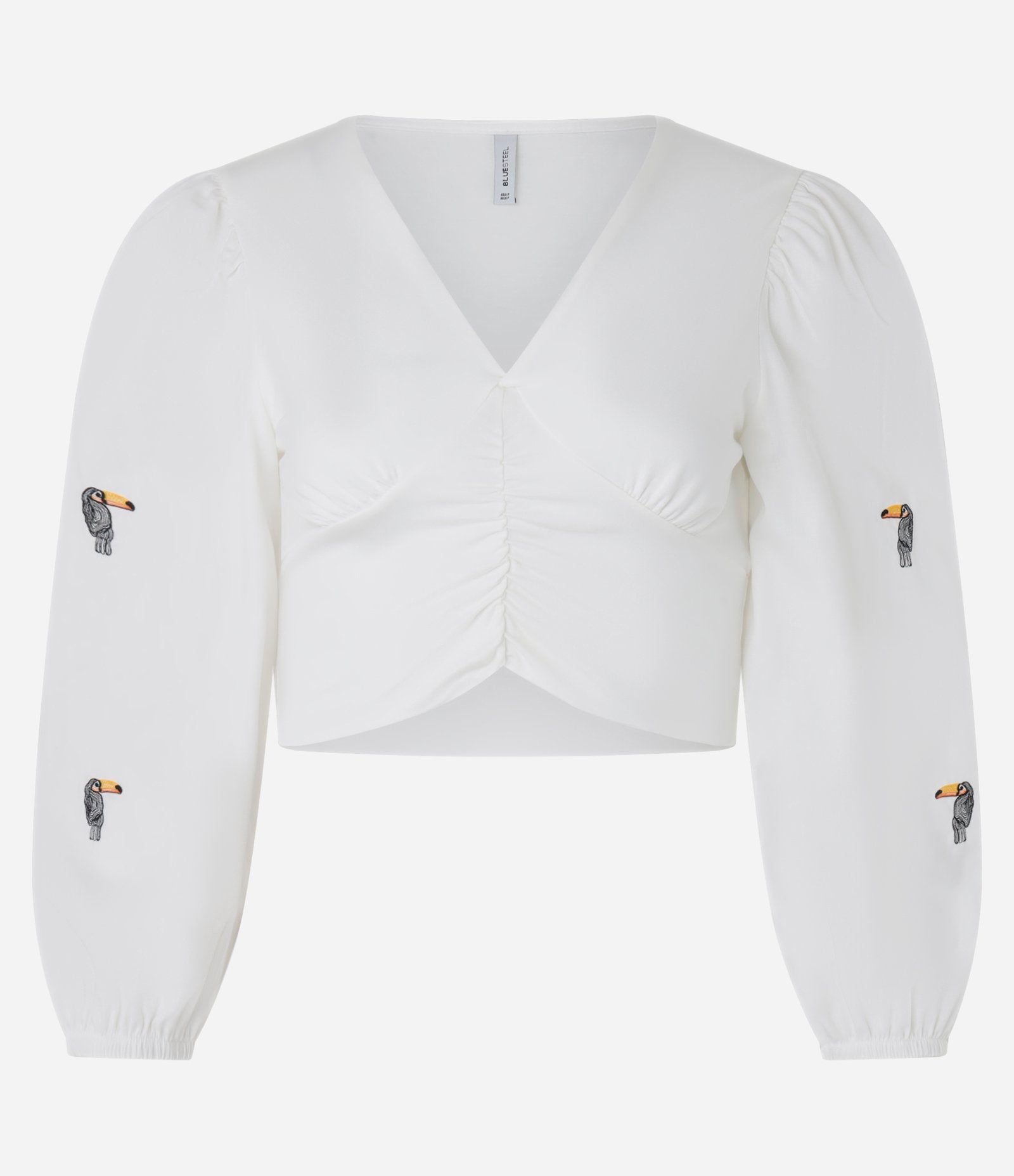 Blusa com Decote V e Mangas Bufantes com Bordado de Tucano Branco