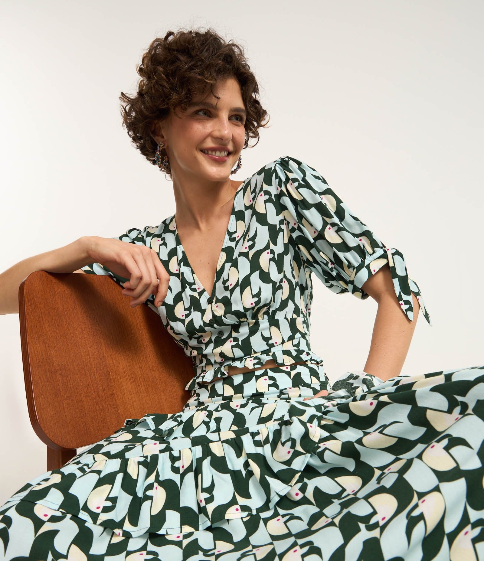 Blusa Cropped de Crepe Preta com Estampa de Tucano