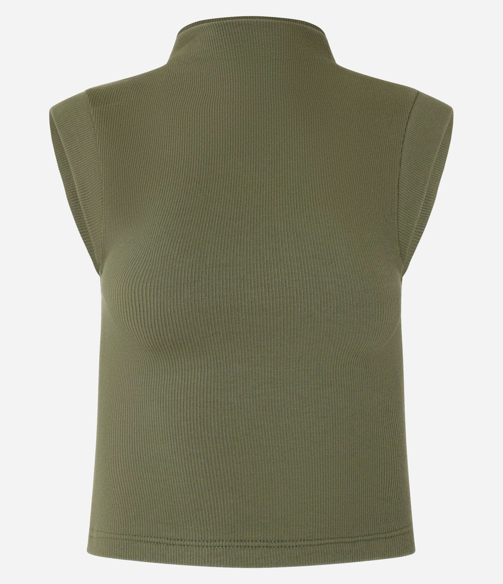 Blusa Verde Canelada com Gola Alta e Cavas Estendidas