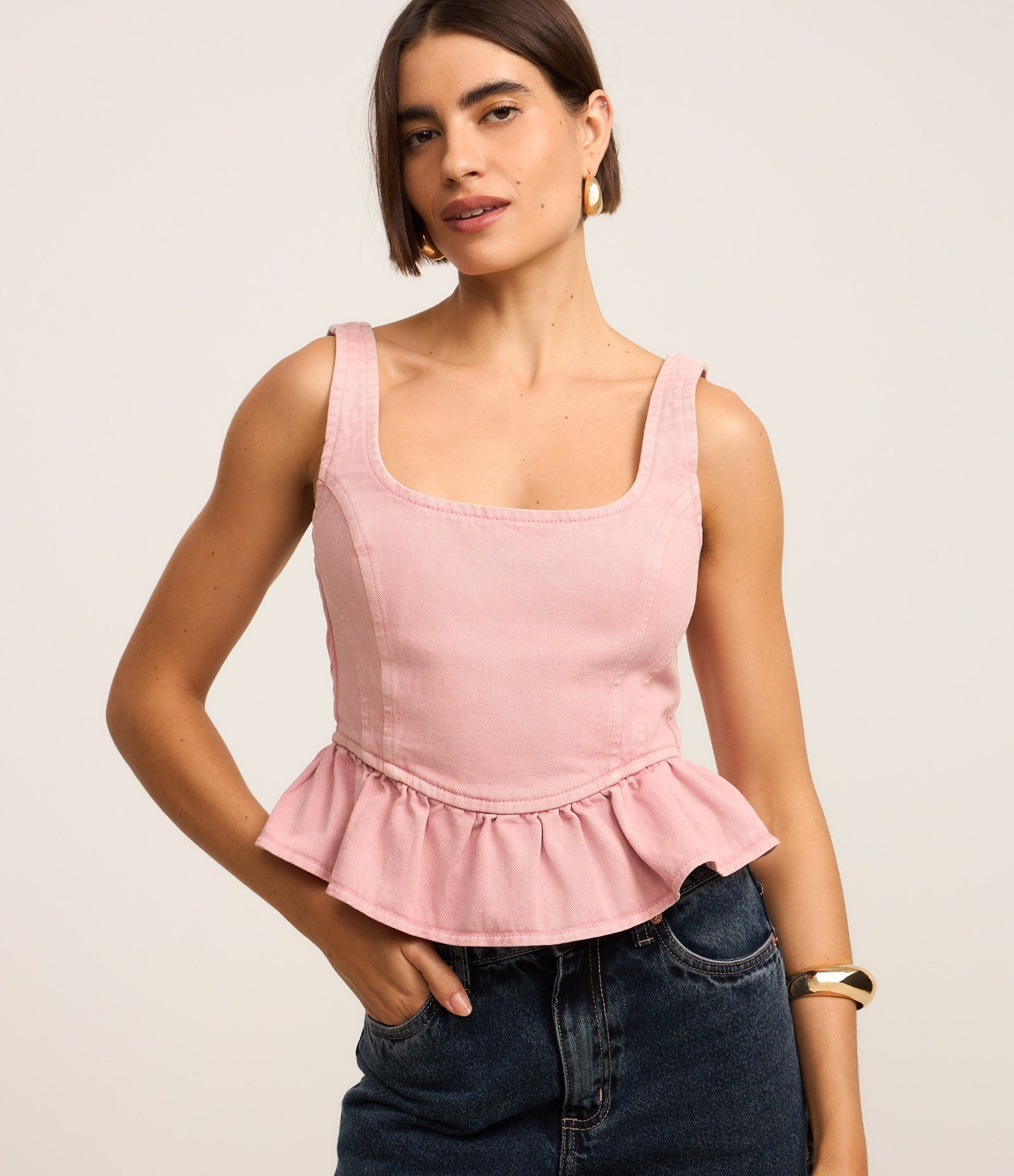 Blusa de Sarja Rosa Estilo Corpete com Barra Babada