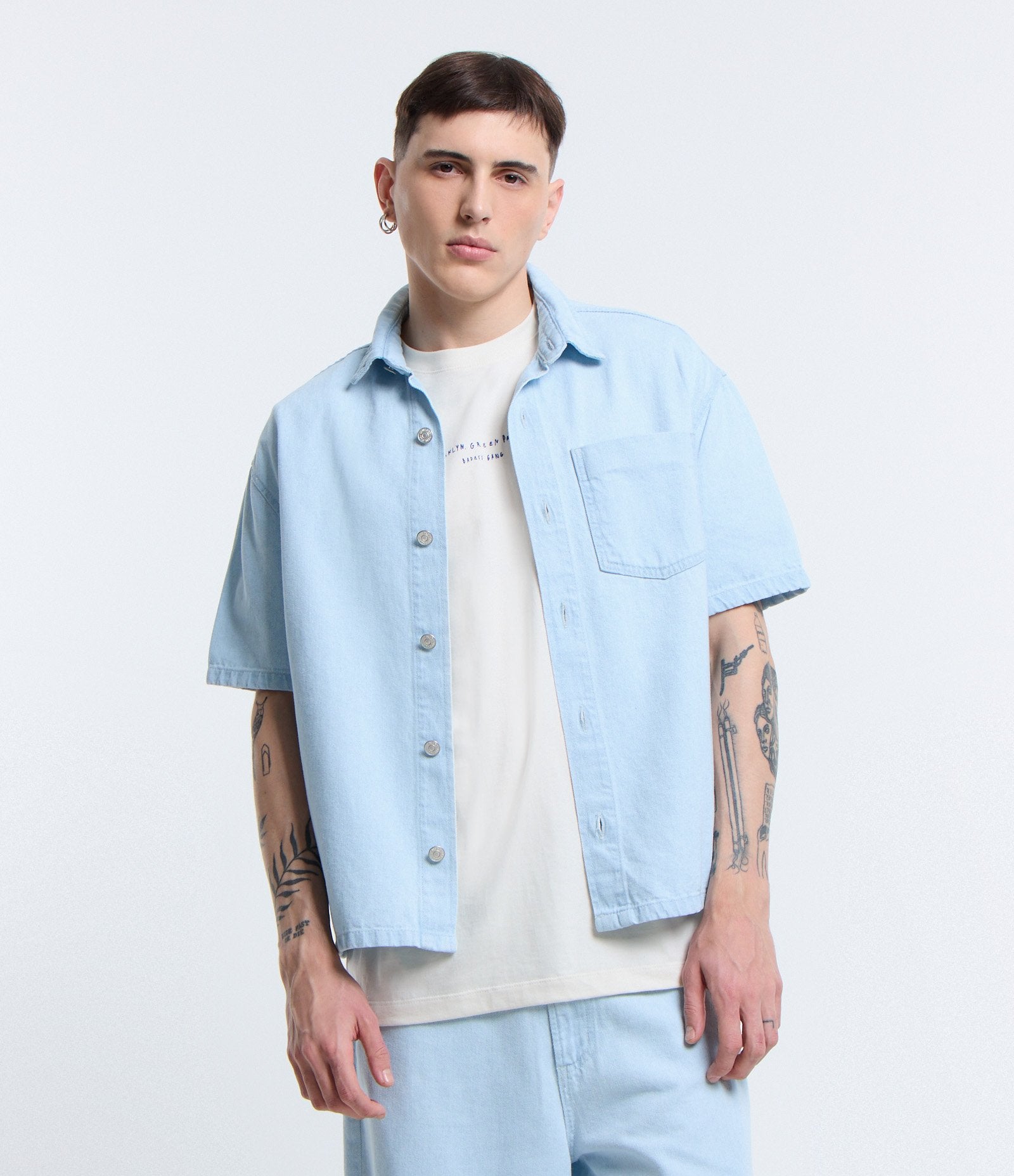 Camisa Boxy Denim com bolso e mangas curtas - Azul