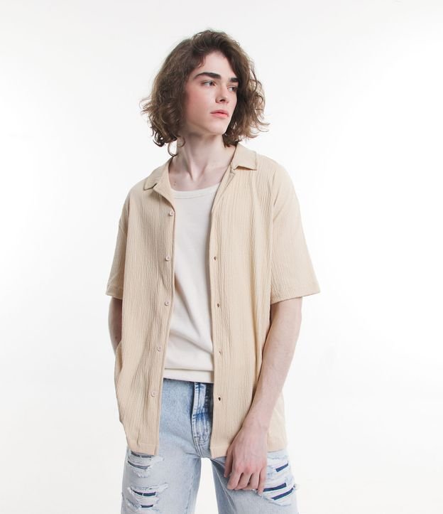 Camisa Bege Descontraída em Tecido Texturizado Crinkle com Mangas Curtas