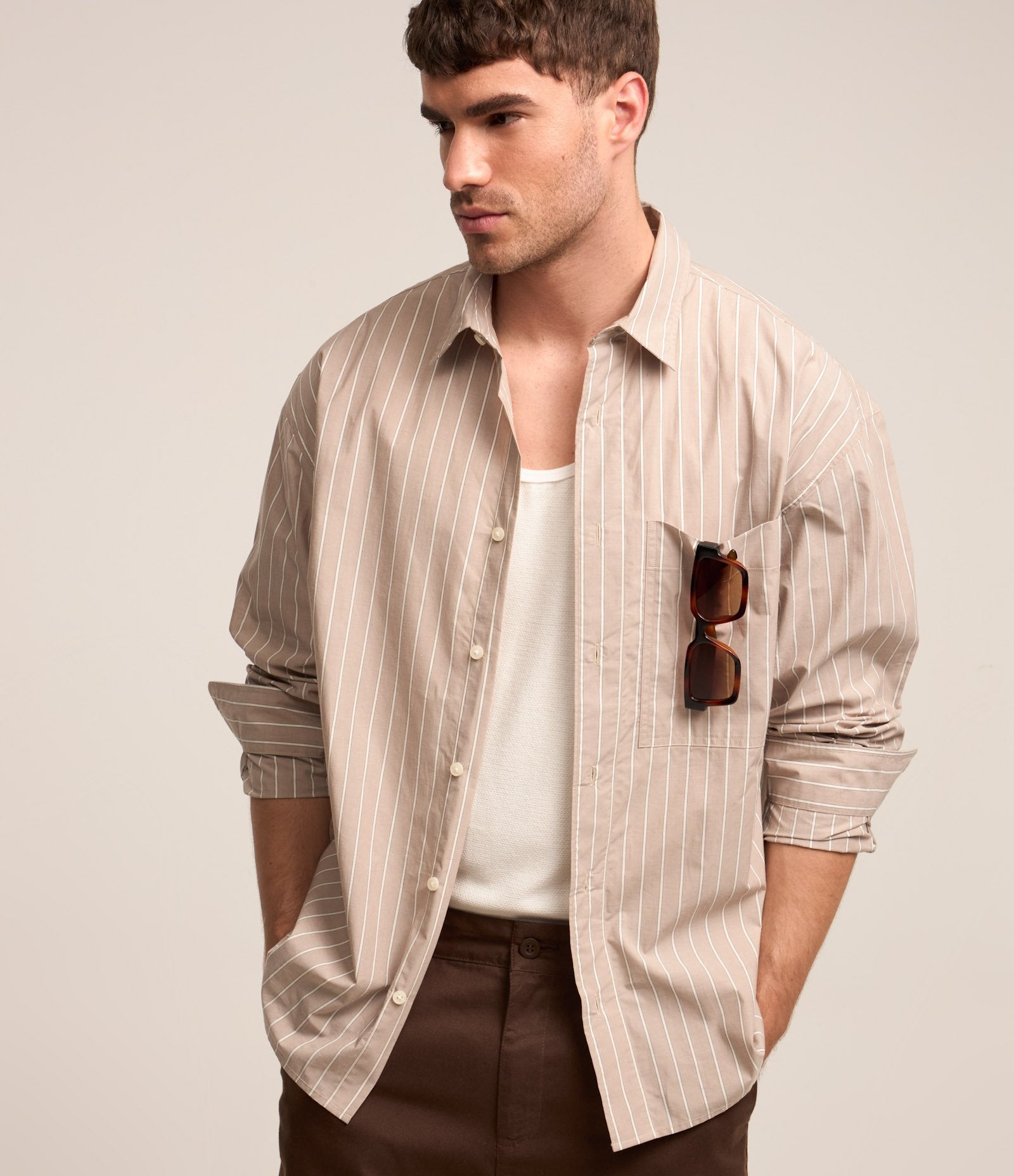Camisa Tricoline Listrada de Ajuste Descontraído com Mangas Longas em Marrom Latte