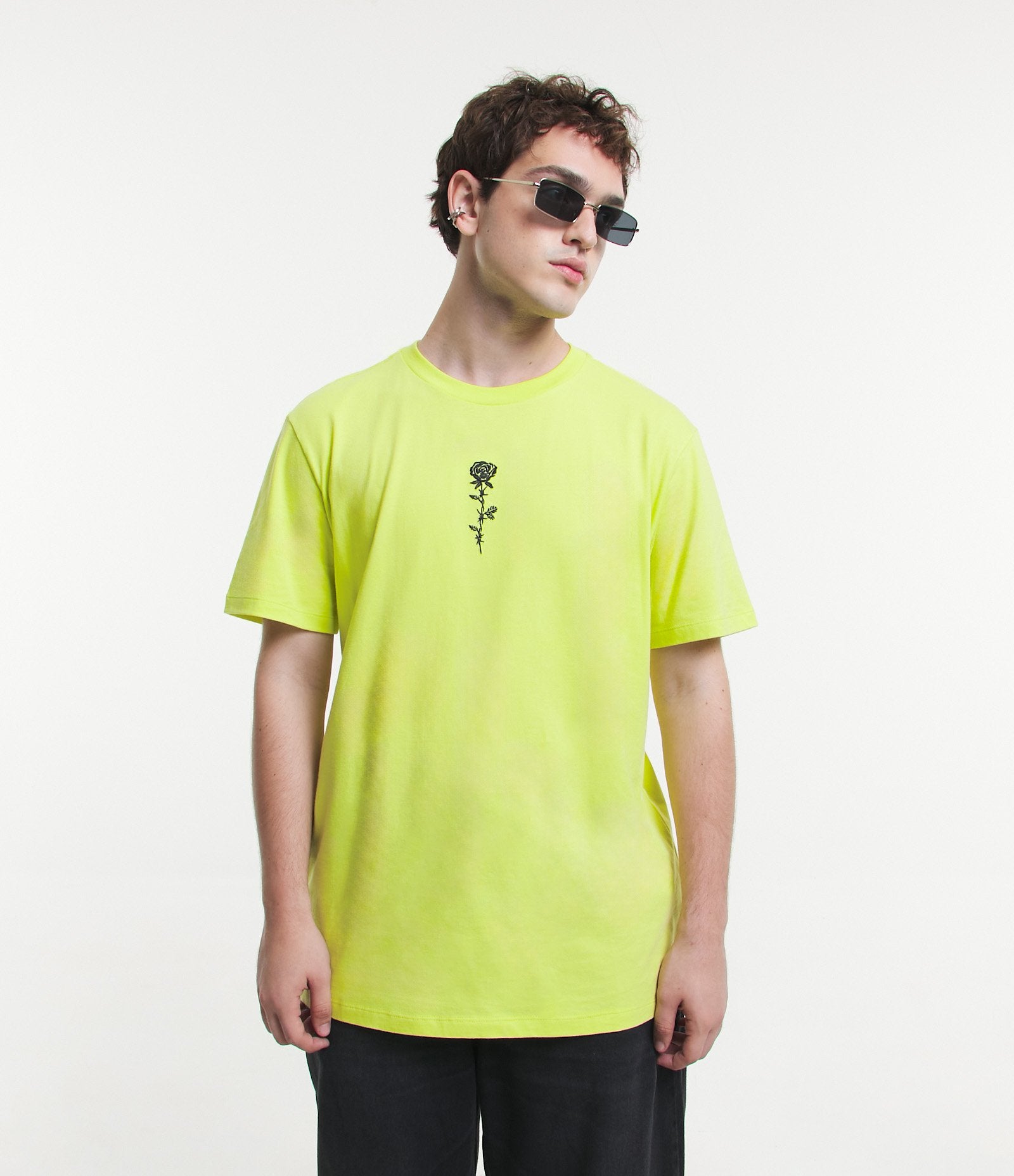 Camiseta Comfort em meia malha com bordado de flores verde-limão