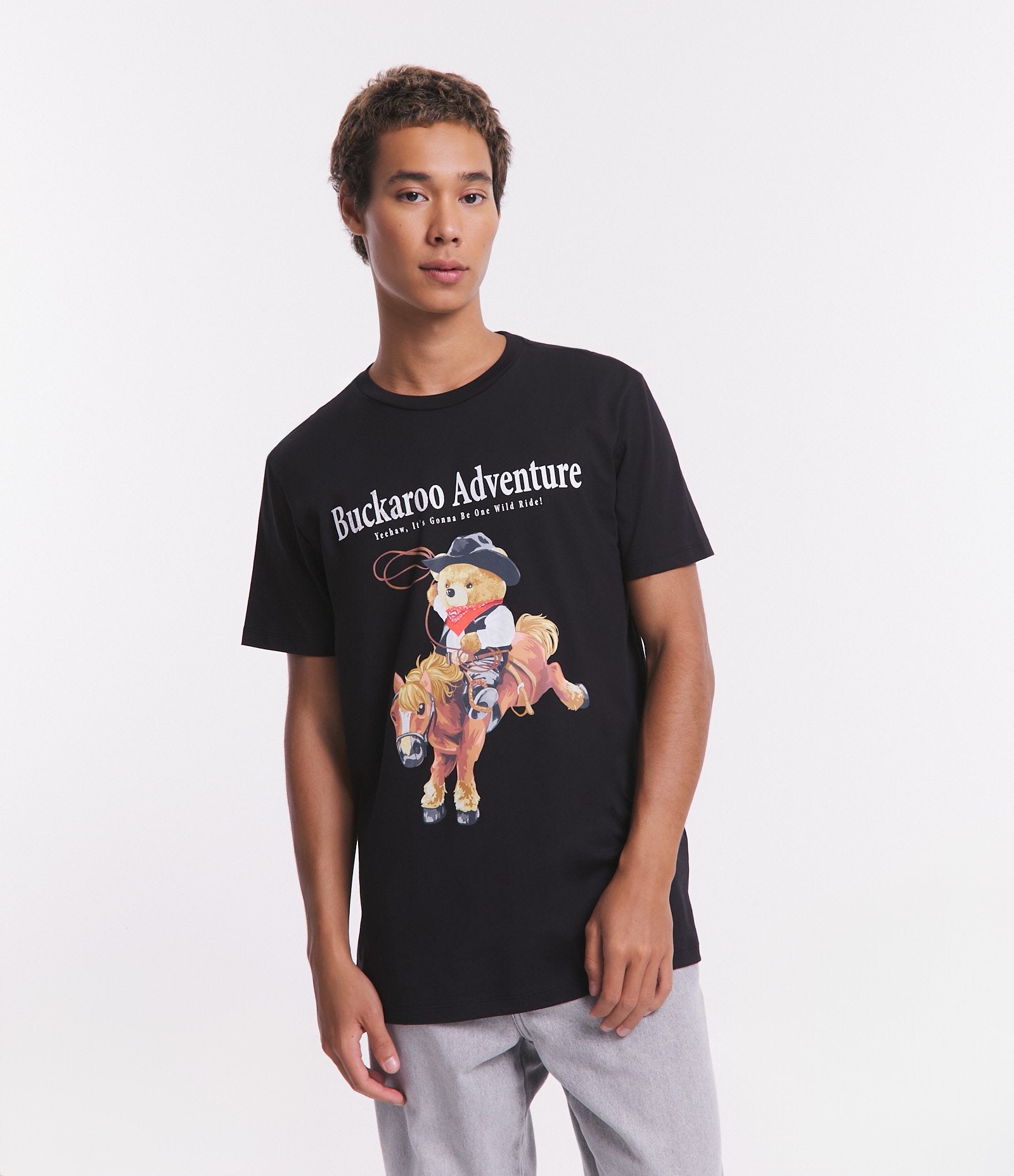 Camiseta Comfort em meia malha com estampa de urso cowboy preto