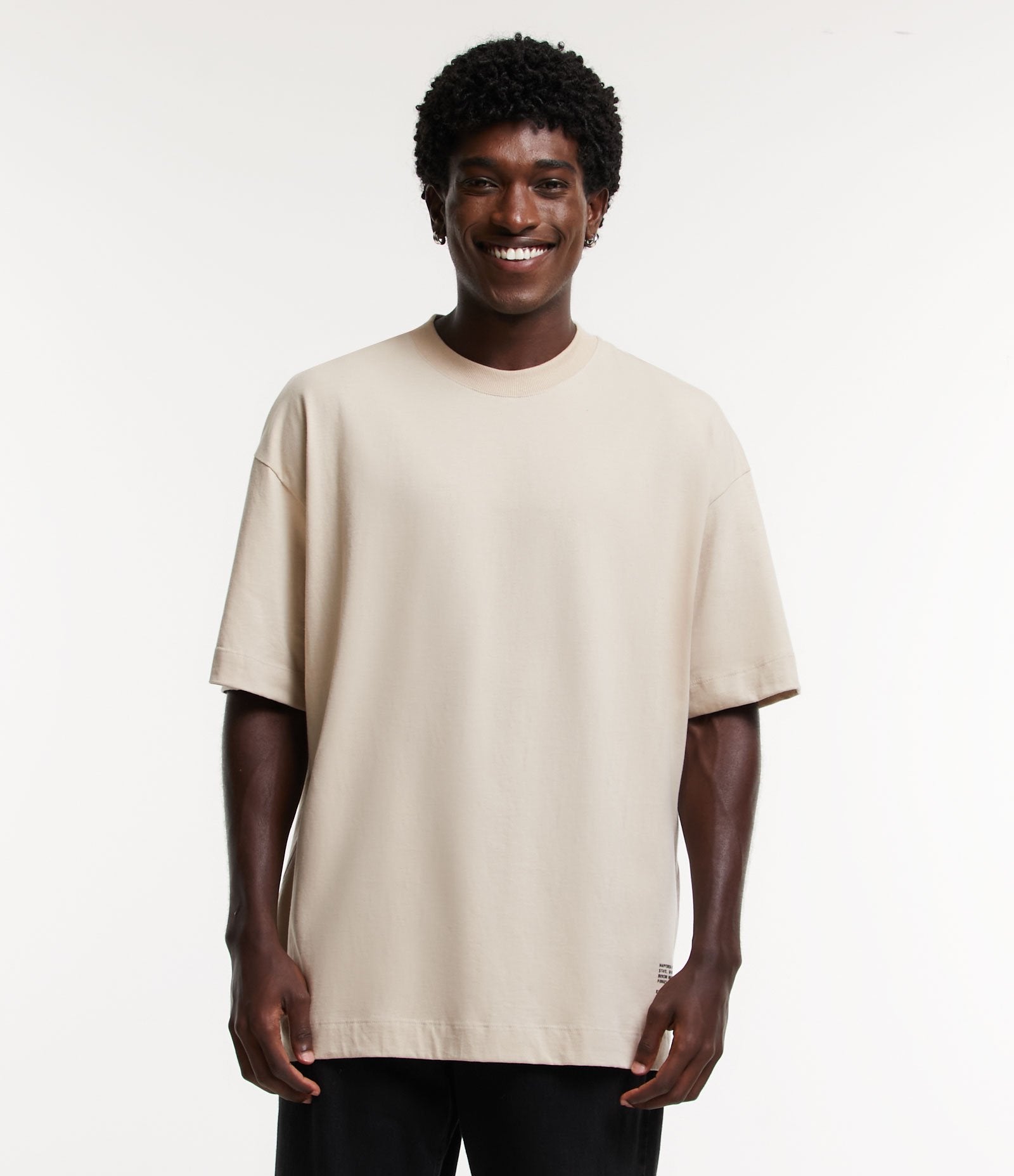 Camiseta de algodão de tamanho grande com impressão de letras na bainha bege