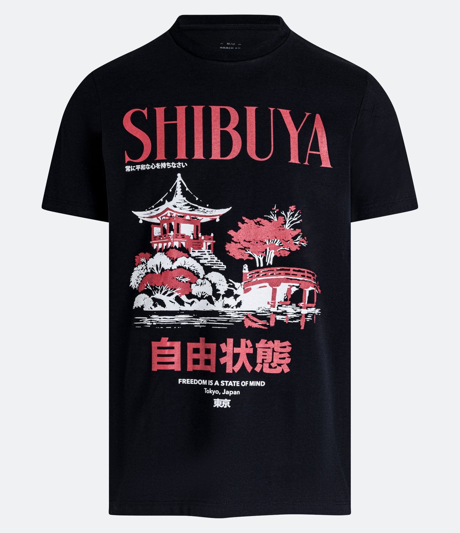 Camiseta Regular Fit com estampa do Templo Oriental de Shibuya e ideograma preto