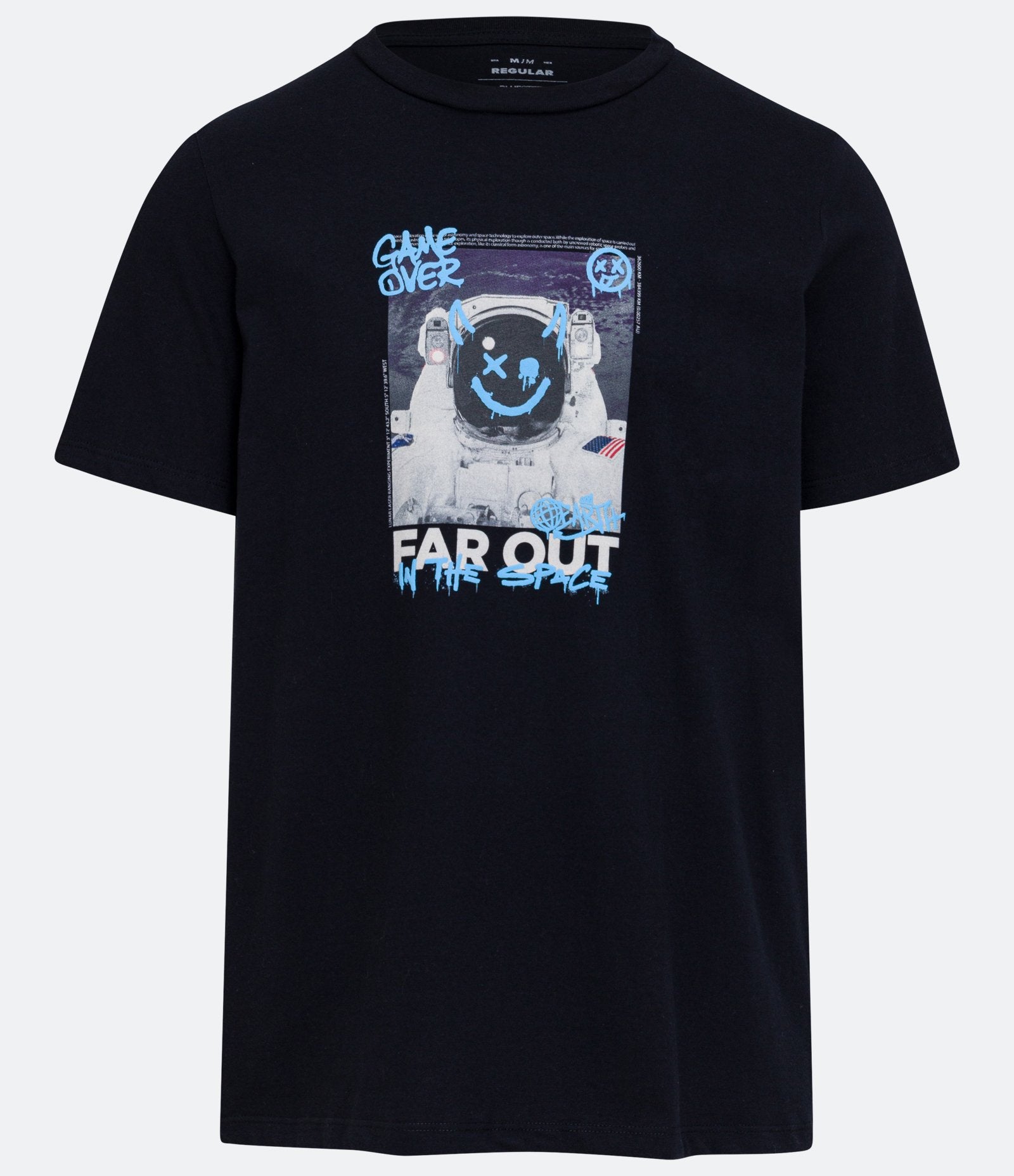 Camiseta Regular Fit em meia malha com estampa de astronauta em grafite preto