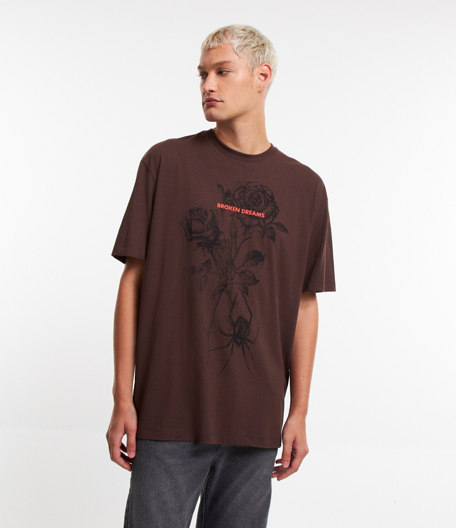 Camiseta relaxada de algodão com estampa de rosas e letras marrons