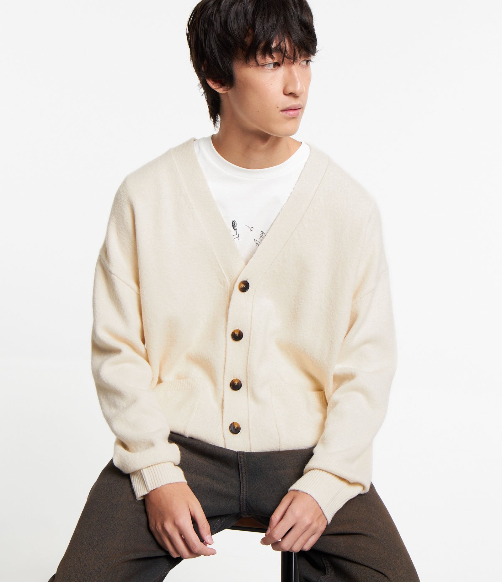 Cardigã de tricô creme bege com botões e bolsos frontais