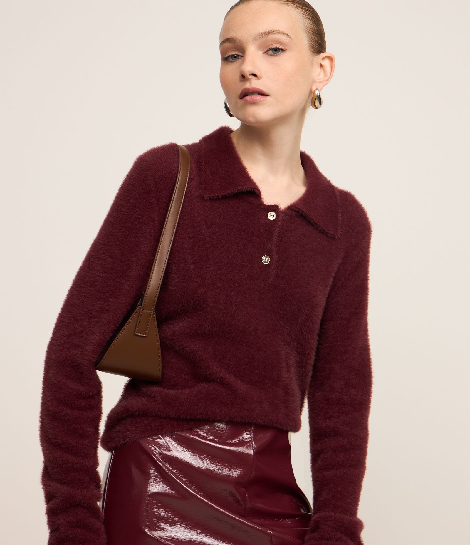 Jaqueta Vermelha de Tricô Felpudo com Gola Polo
