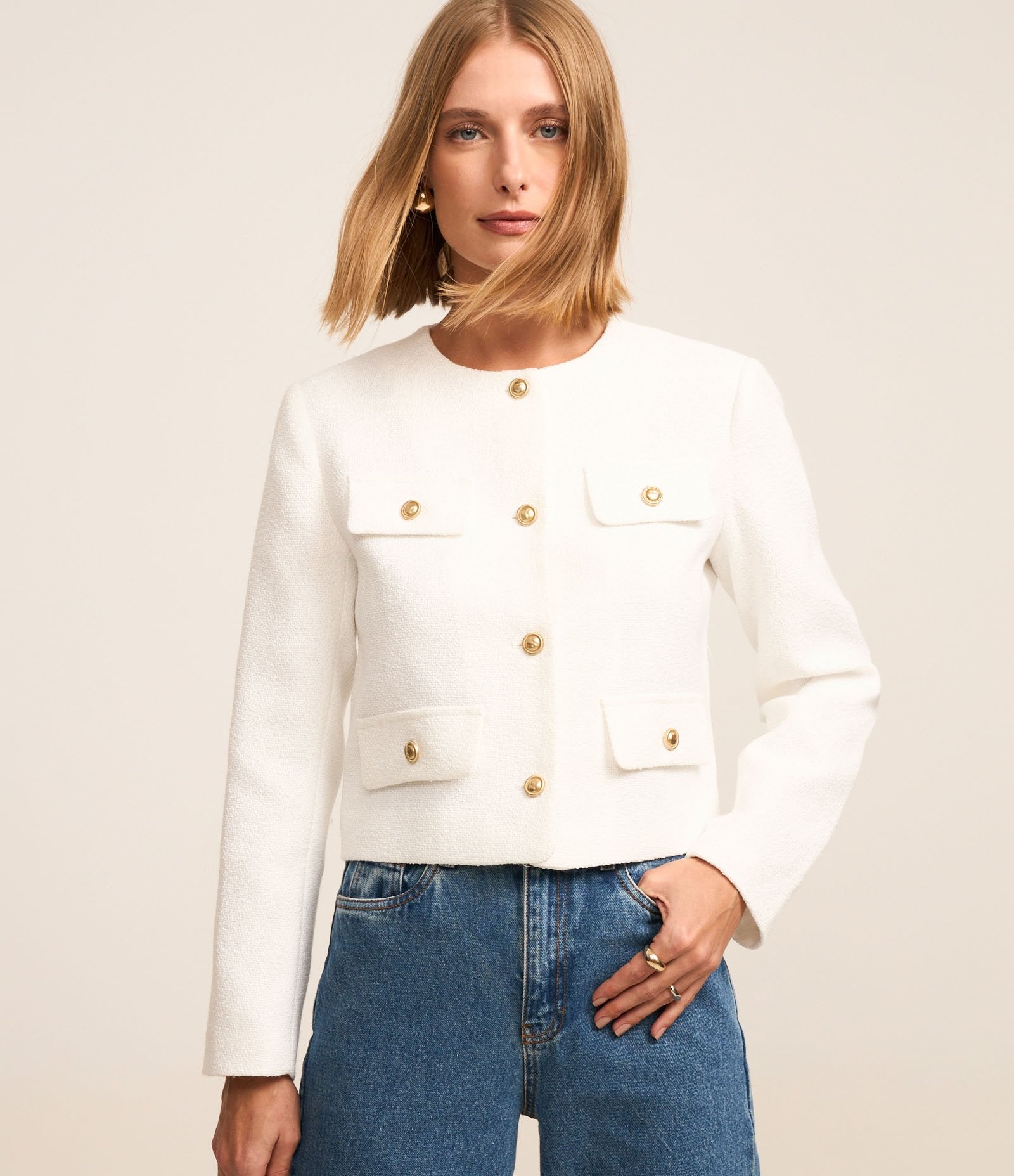 Jaqueta de Tweed com Botões Metálicos e Lapelas Brancas