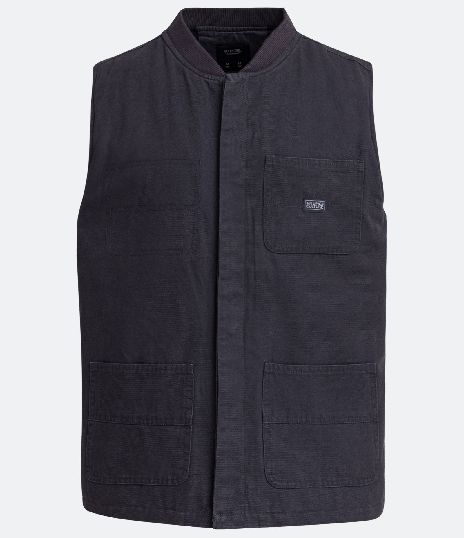 Colete de sarja cinza com gola em V e bolsos táticos