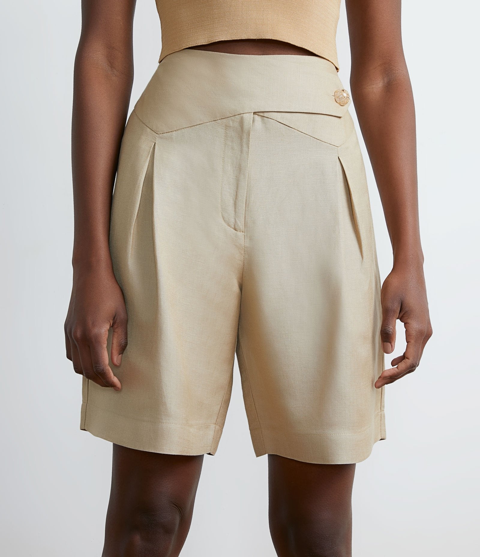 Bermuda de linho bege com recortes exclusivos na cintura e pregas na frente