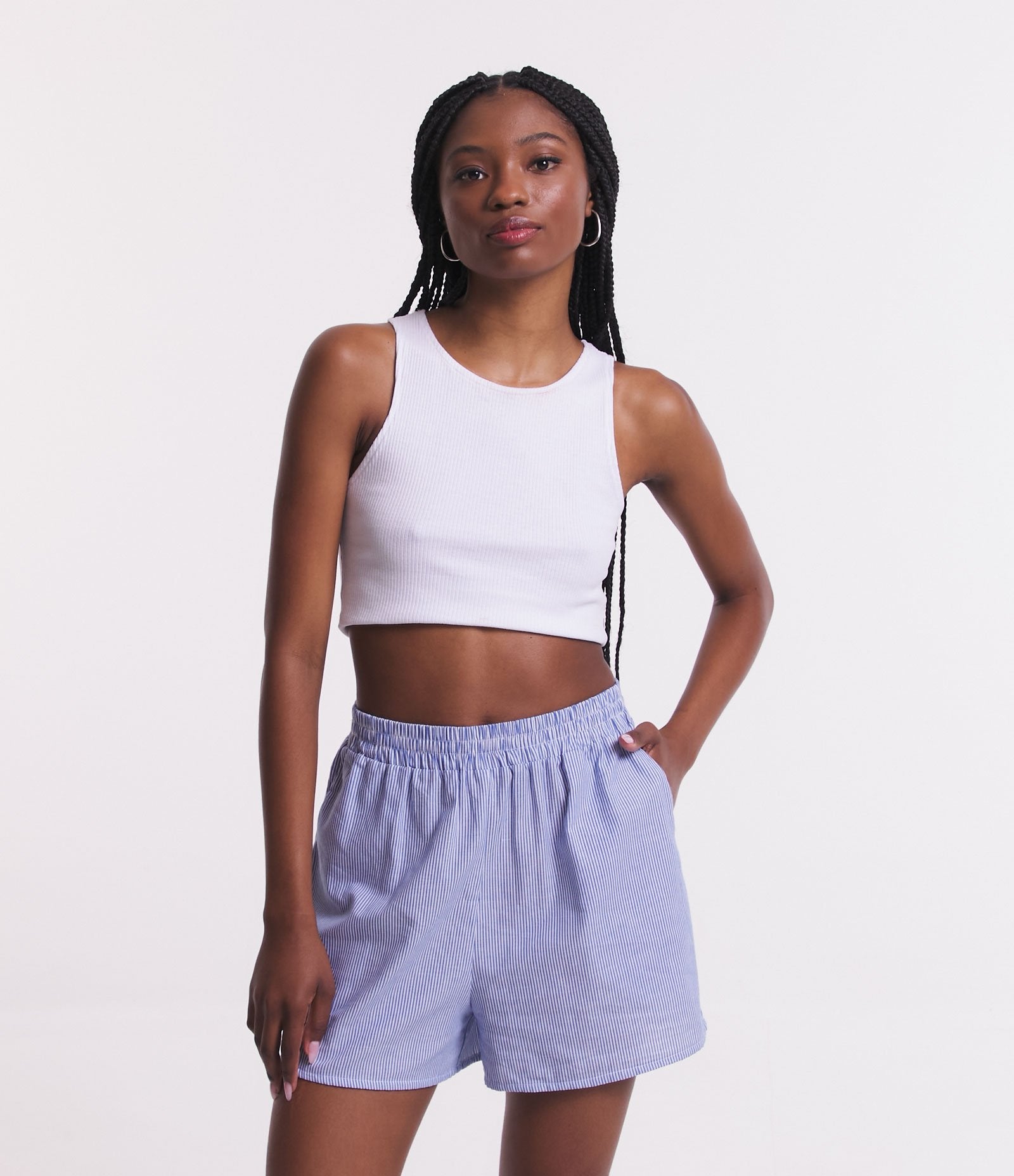 Bermuda Tricoline Listrada com Cós Elástico Azul da Renner - Experimente a combinação perfeita de conforto, qualidade e estilo em cada peça.