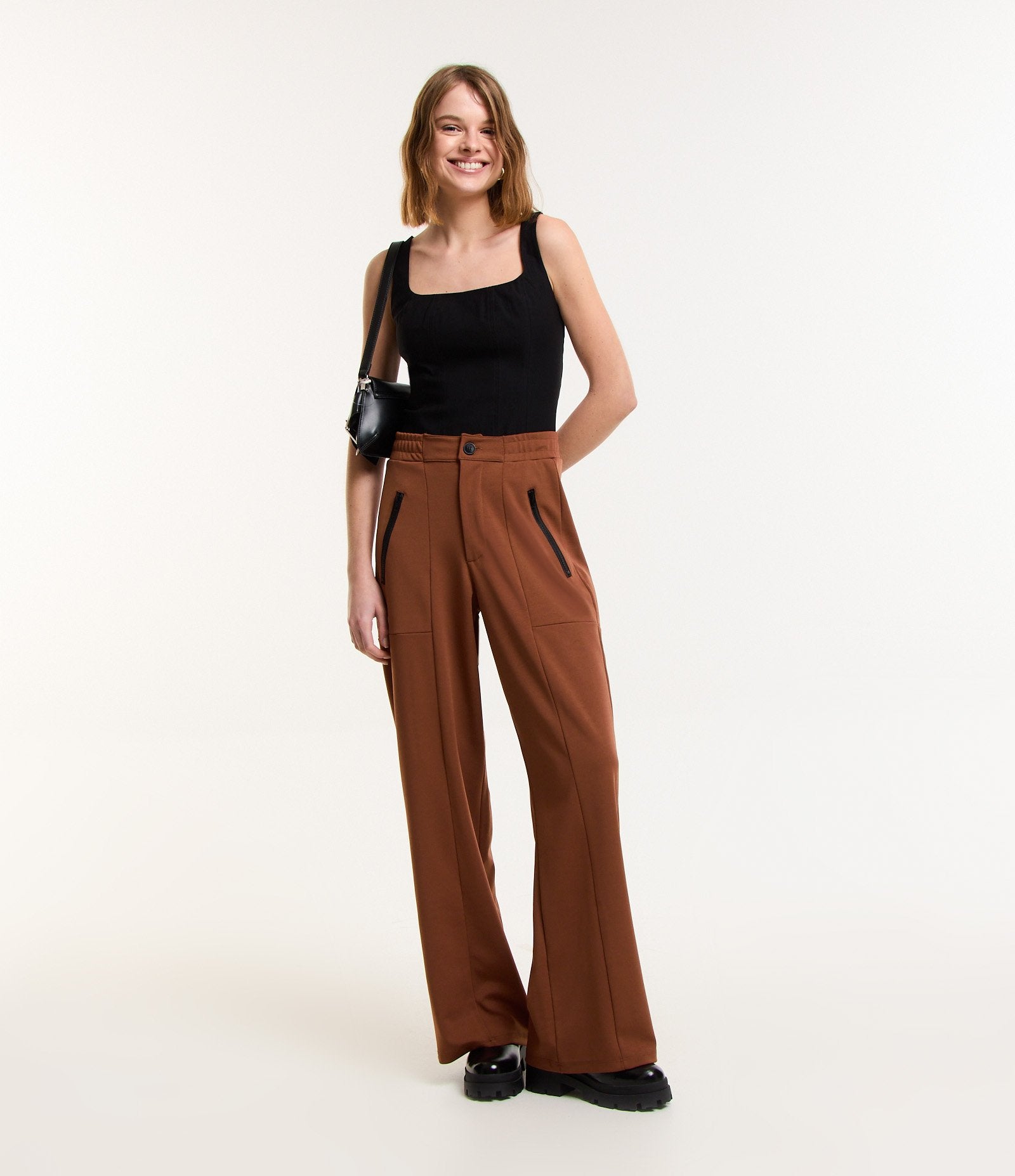 Calça alfaiataria em malha Roma com detalhes em Sportcore e bolsos em marrom da Renner - Experimente conforto, qualidade e estilo em cada peça.
