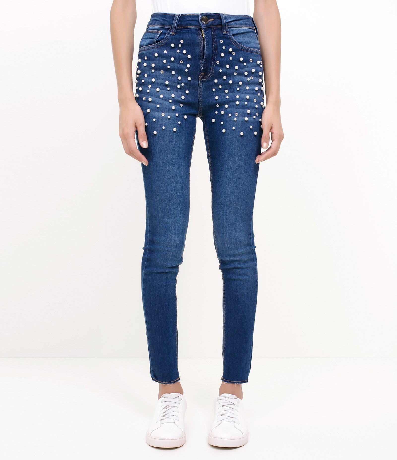 Calça jeans azul com pérolas artificiais