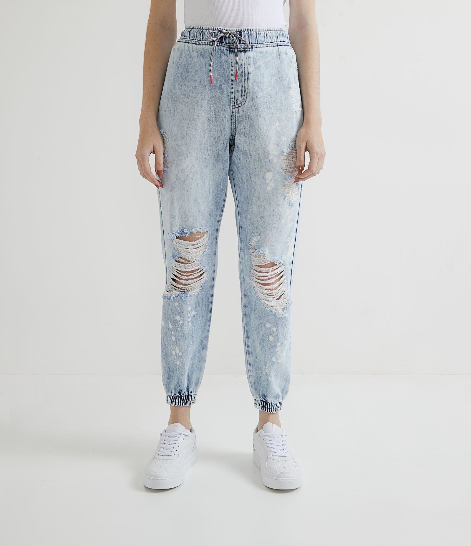 Calça Jogger Jeans com detalhes desgastados e salpicados em azul da Renner - Experimente o conforto incomparável, a qualidade excepcional e o estilo sem esforço em cada peça.