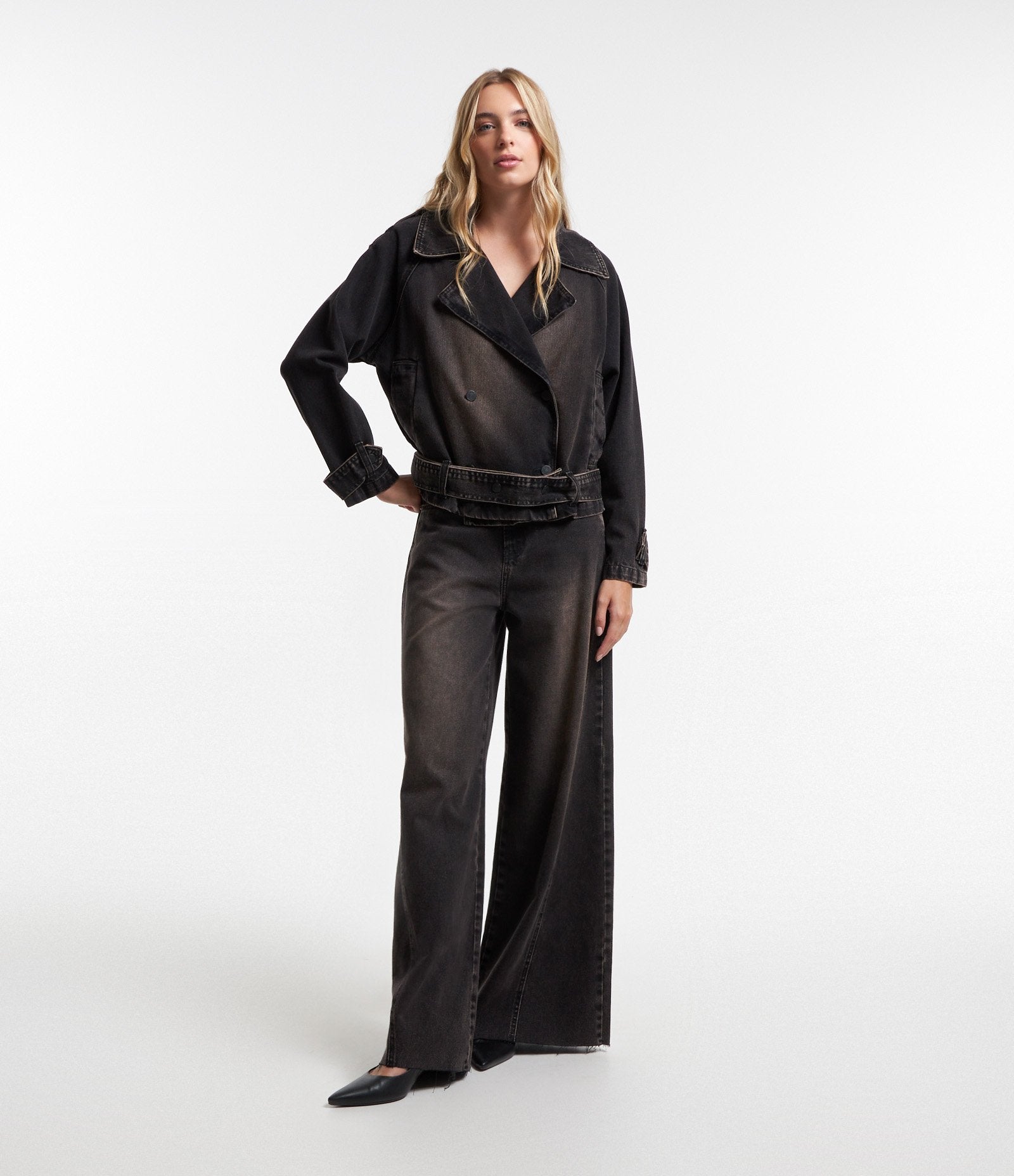 Calça Palazzo Jeans com lavagem suja e detalhes em preto cruzado da Renner - Experimente o conforto inigualável, a qualidade excepcional e o estilo atemporal em cada peça.