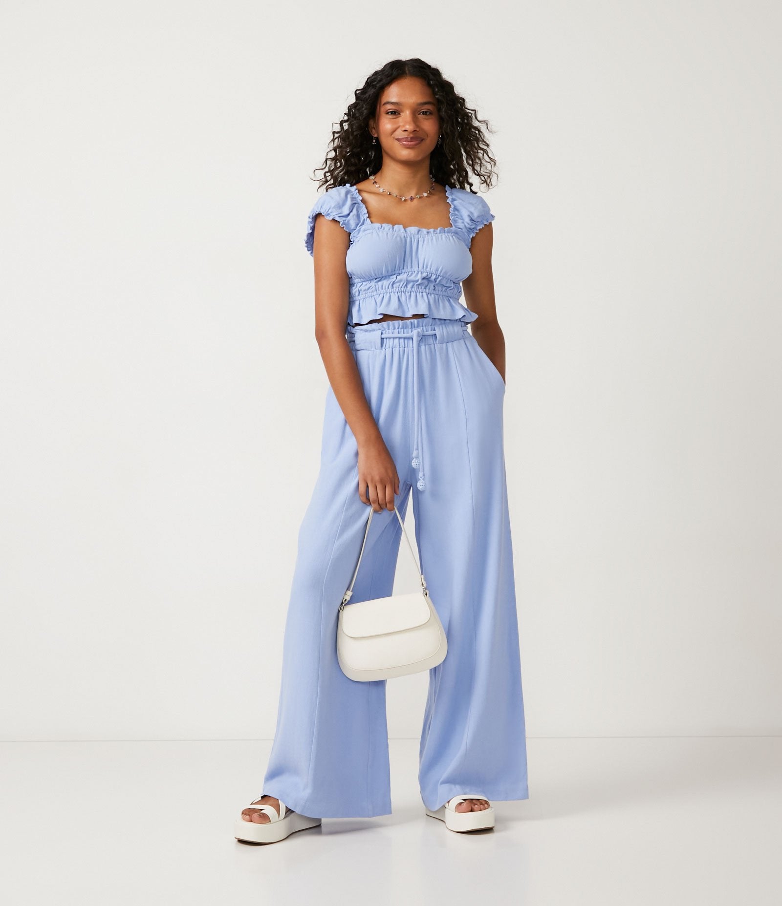 Calças de linho de perna larga com cinto de corda em azul da Renner - experimente o conforto, a qualidade e o estilo em cada peça.