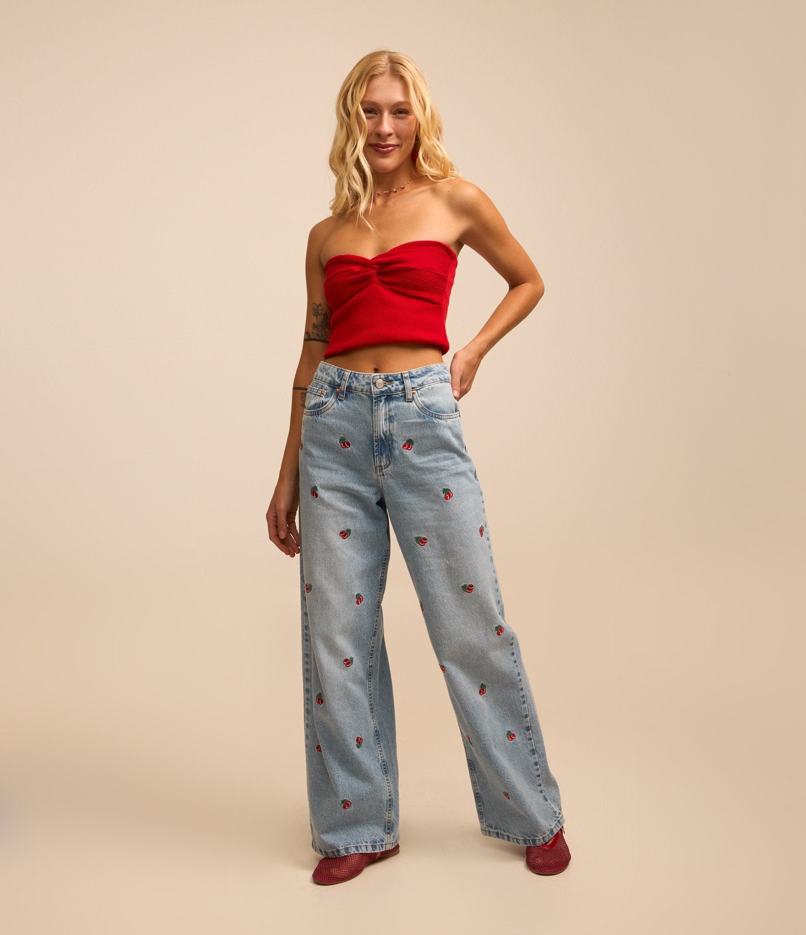 Jeans Wide Leg com bordado Blue Cherry da Renner - Experimente o conforto inigualável, a qualidade excepcional e o estilo atemporal em cada peça.