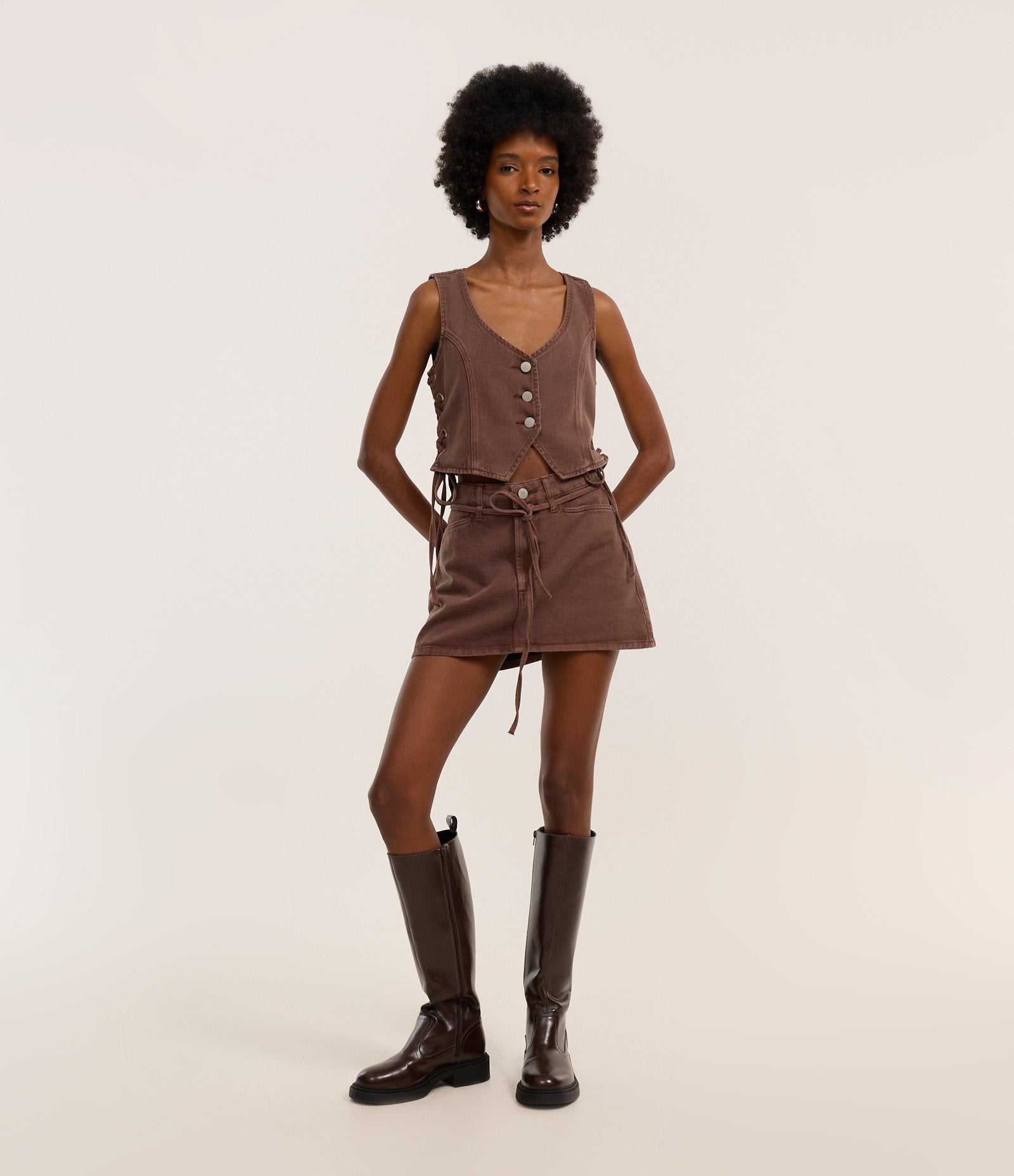 Mini-saia em brim tingido com catiônica e amarração na cintura marrom