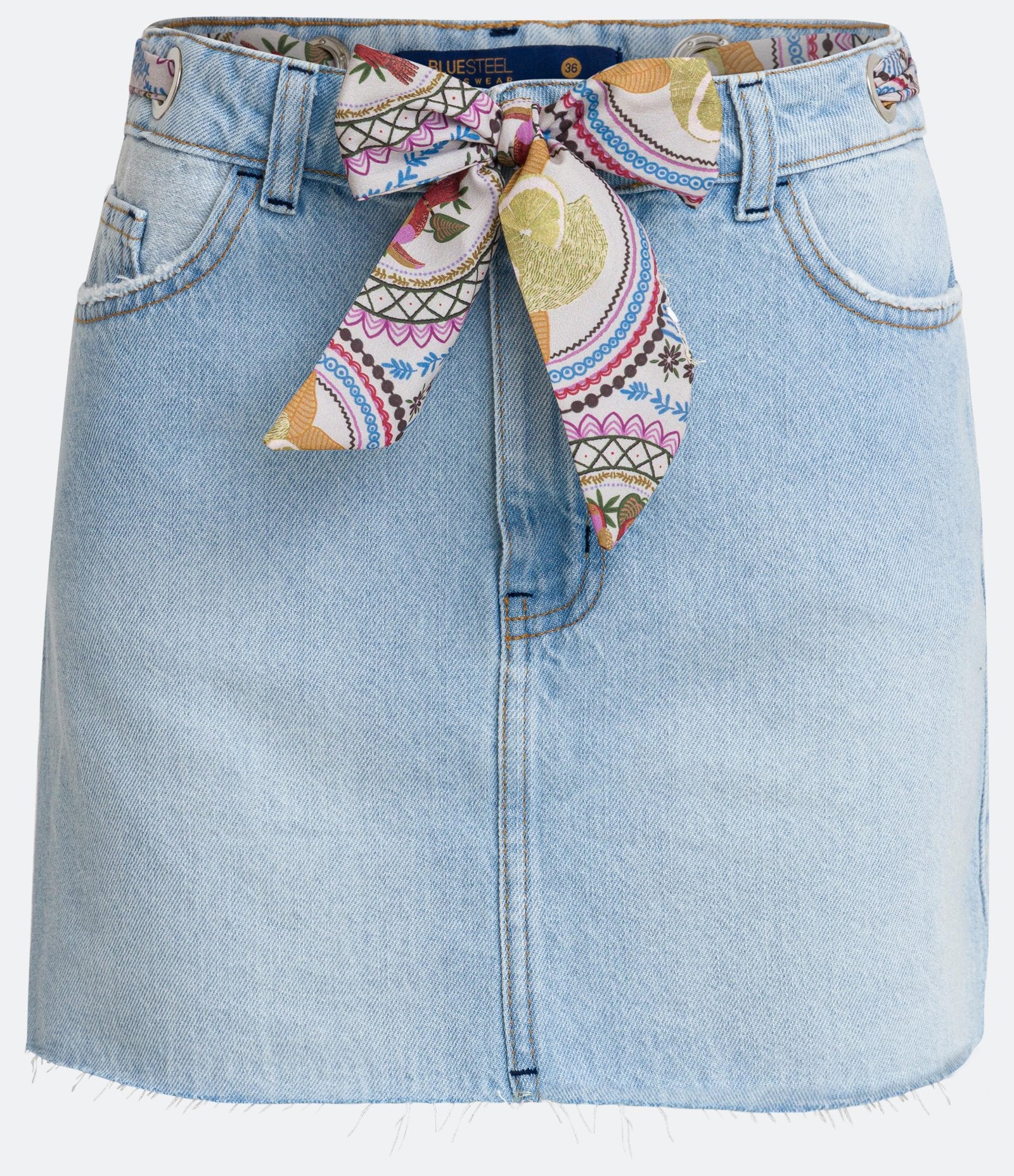 Saia curta de brim de cintura alta com cinto de lenço de mandala azul