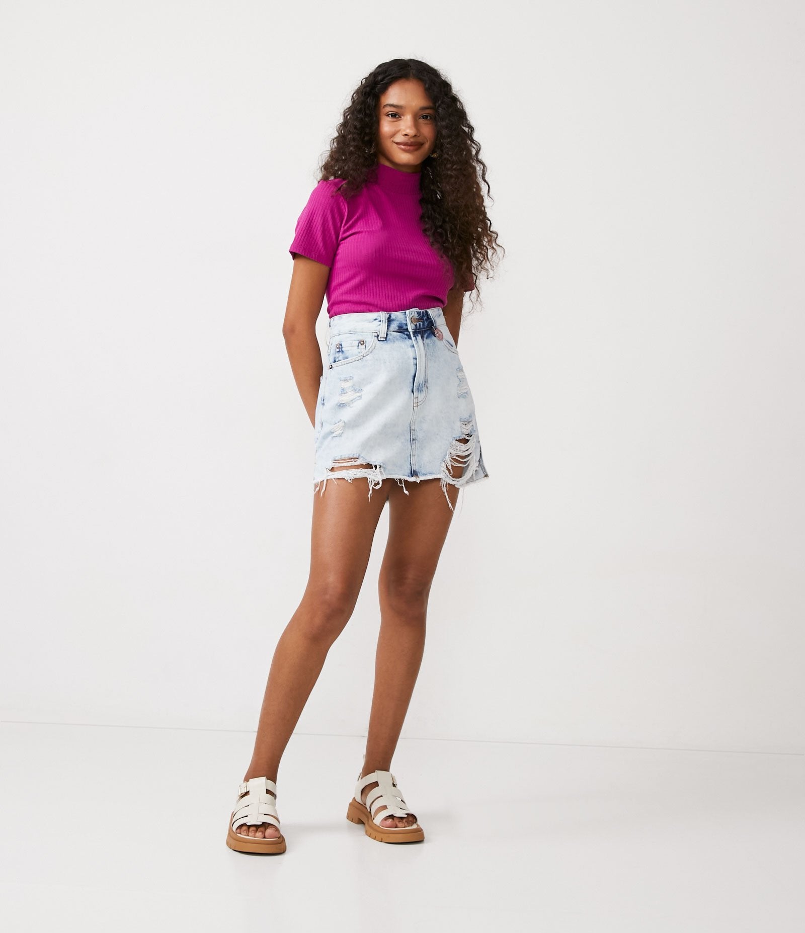 Mini-saia de brim azul desgastada de cintura alta com bainha desfiada