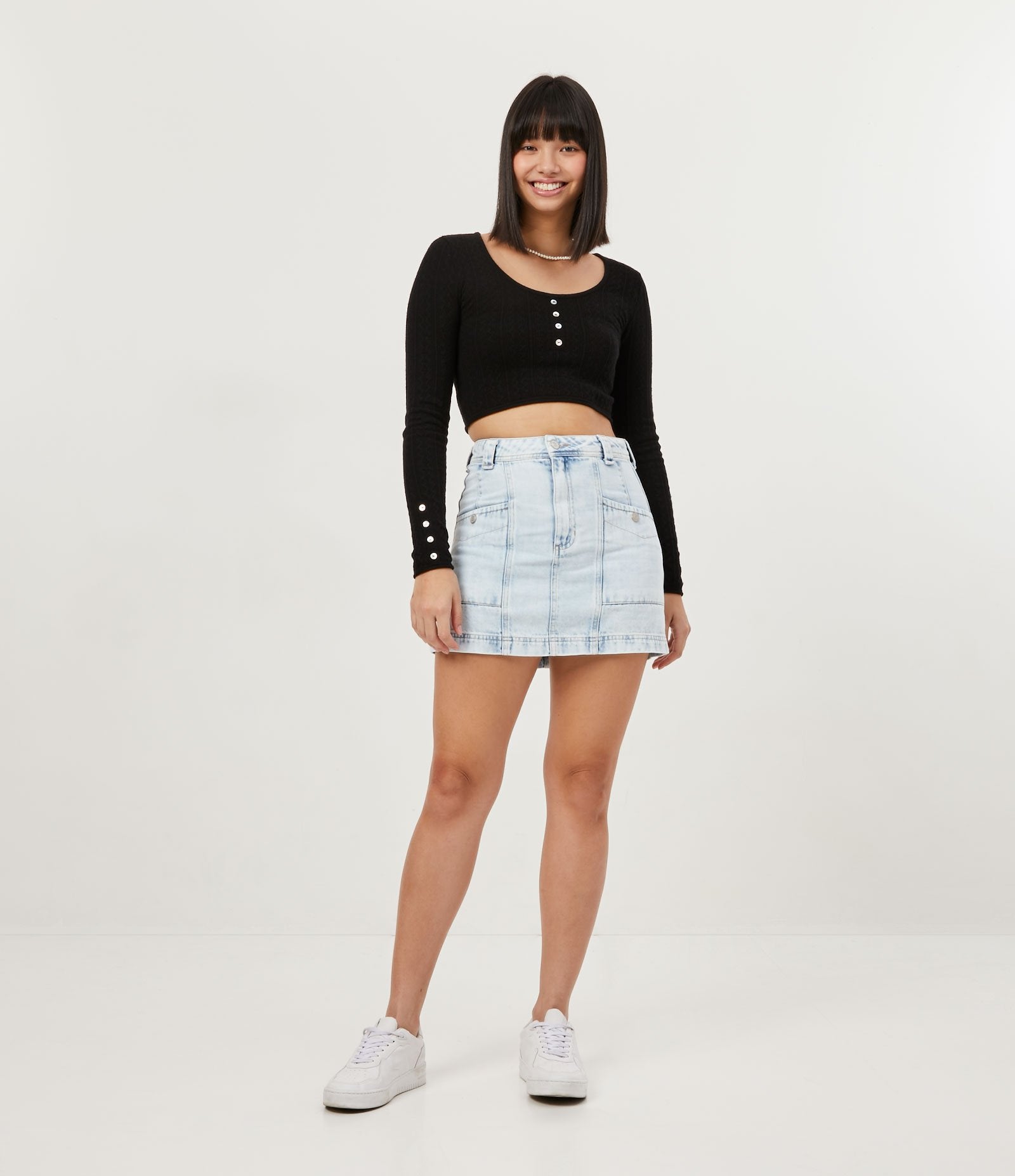 Mini-saia jeans em lavagem clara com bolsos frontais da Renner - Experimente o conforto, a qualidade e o estilo em cada peça.