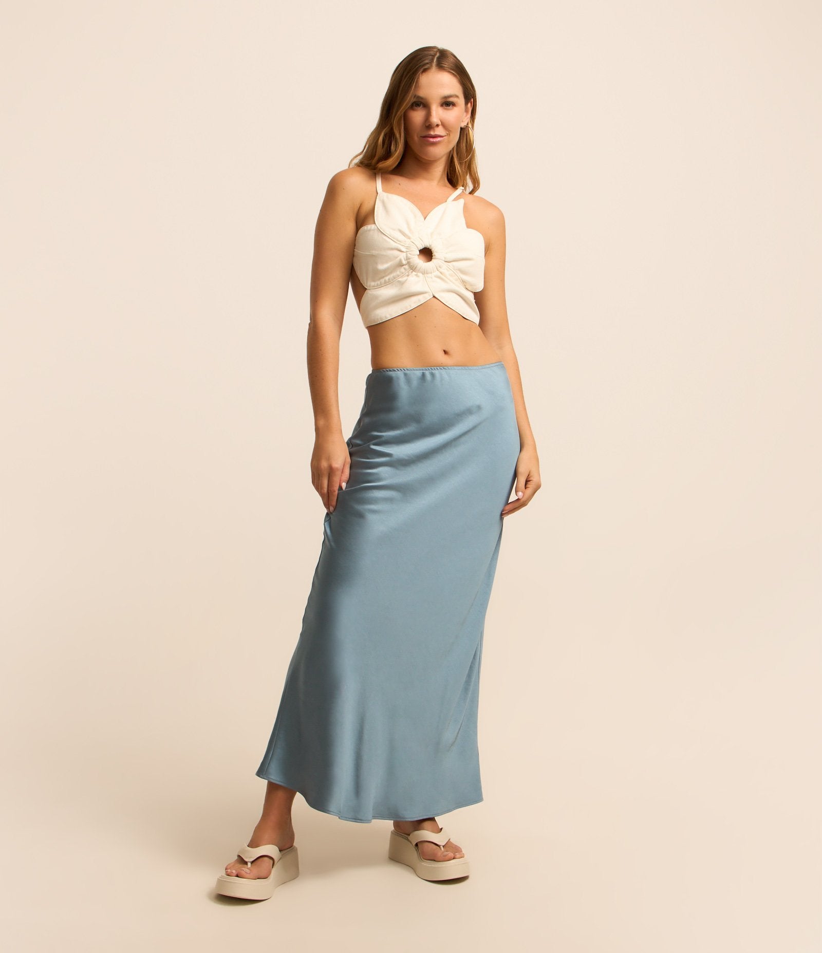 Saia longa de cetim com elástico na cintura em azul da Renner - Experimente a combinação perfeita de conforto, qualidade e estilo em cada peça.