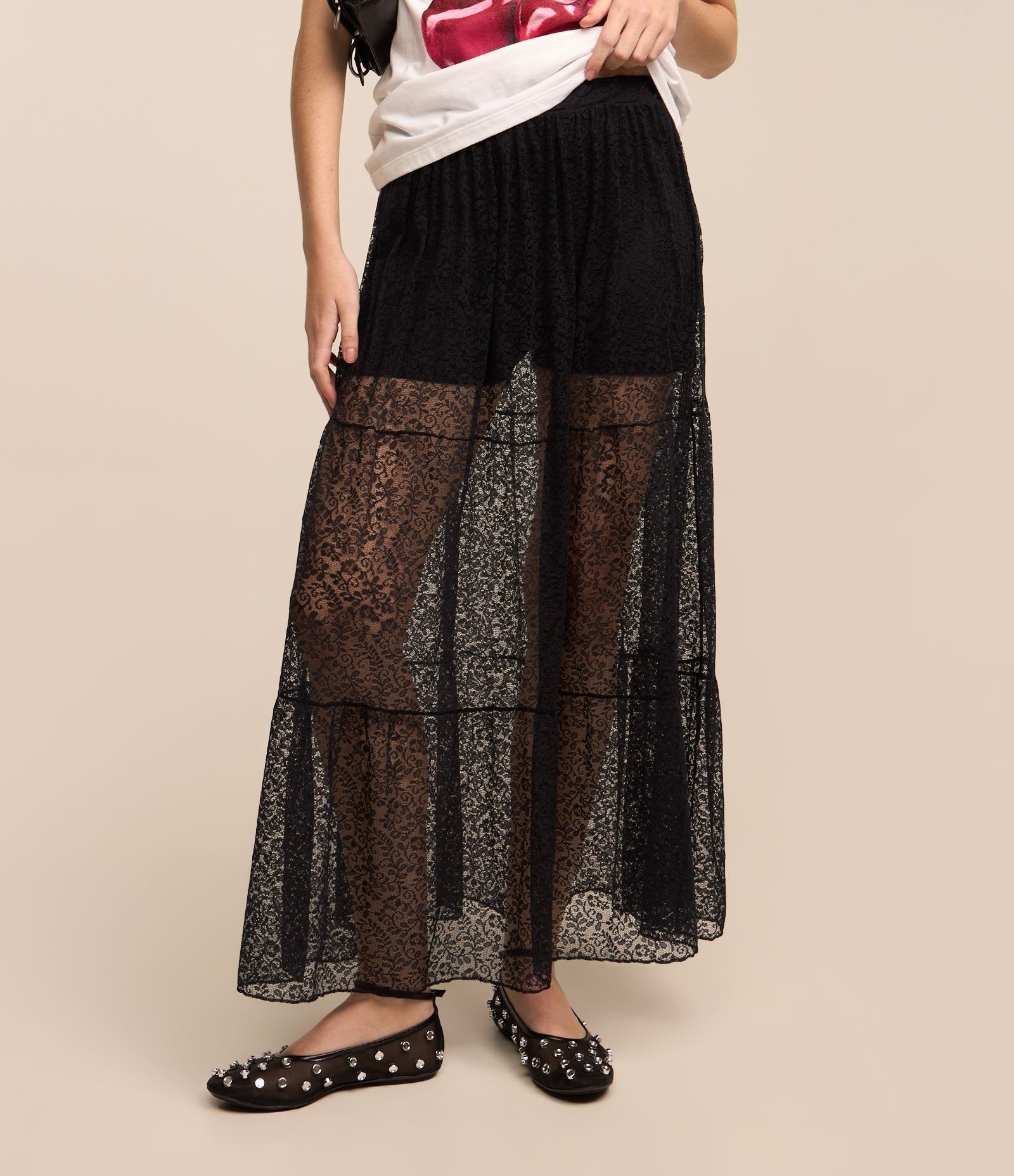 Saia longa de renda com forro curto e bainha preta recortada da Renner - experimente conforto, qualidade e estilo em cada peça.