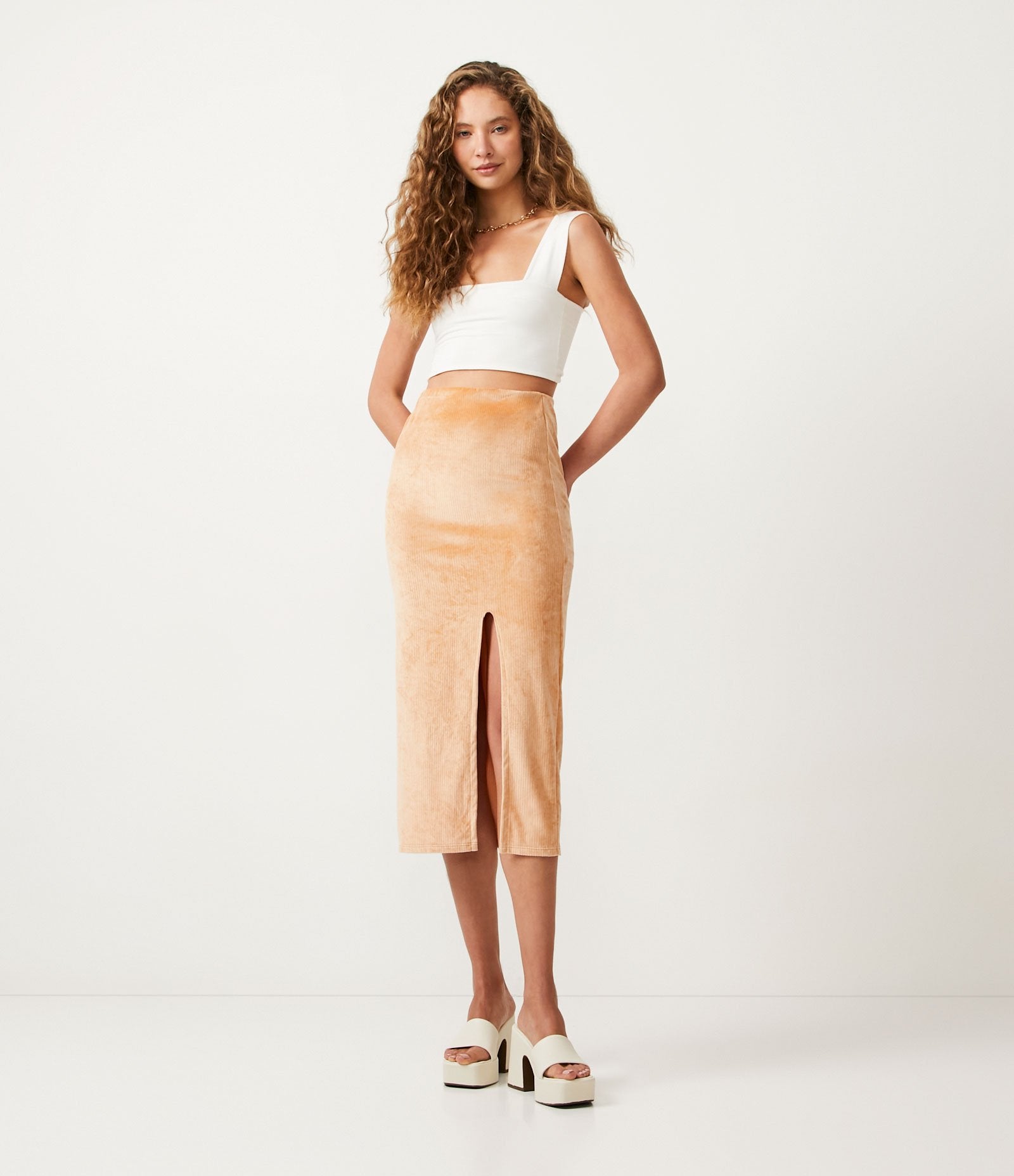 Saia midi de veludo bege com fenda lateral da Renner - Experimente a combinação perfeita de conforto, qualidade e estilo em cada peça.