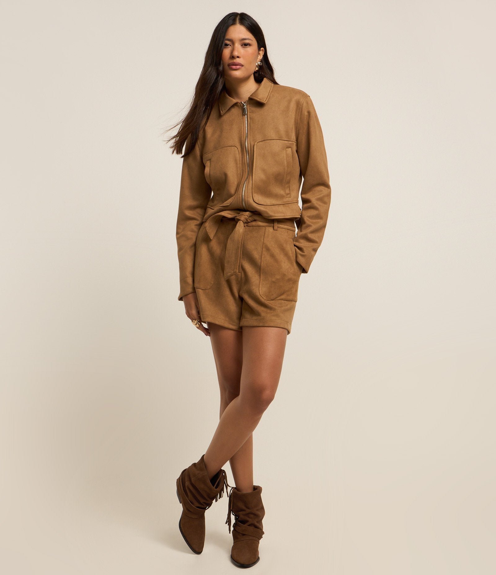 Shorts Suedine marrom de cintura alta com cinto e bolsos de remendo