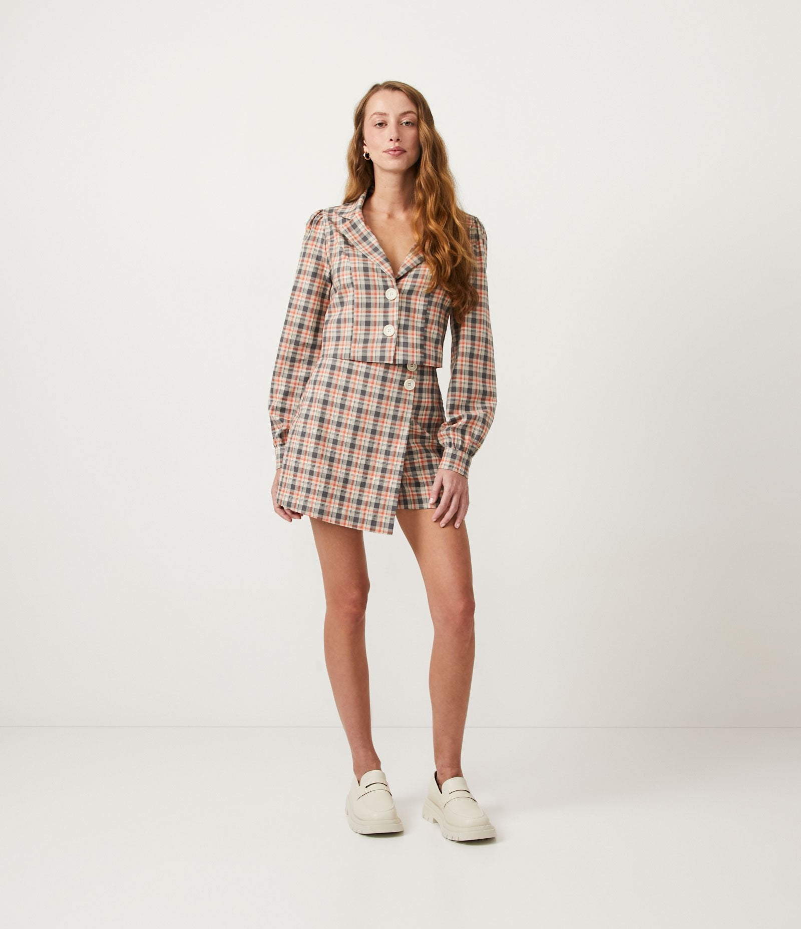 Mini-saia de algodão xadrez com botões vermelhos contrastantes