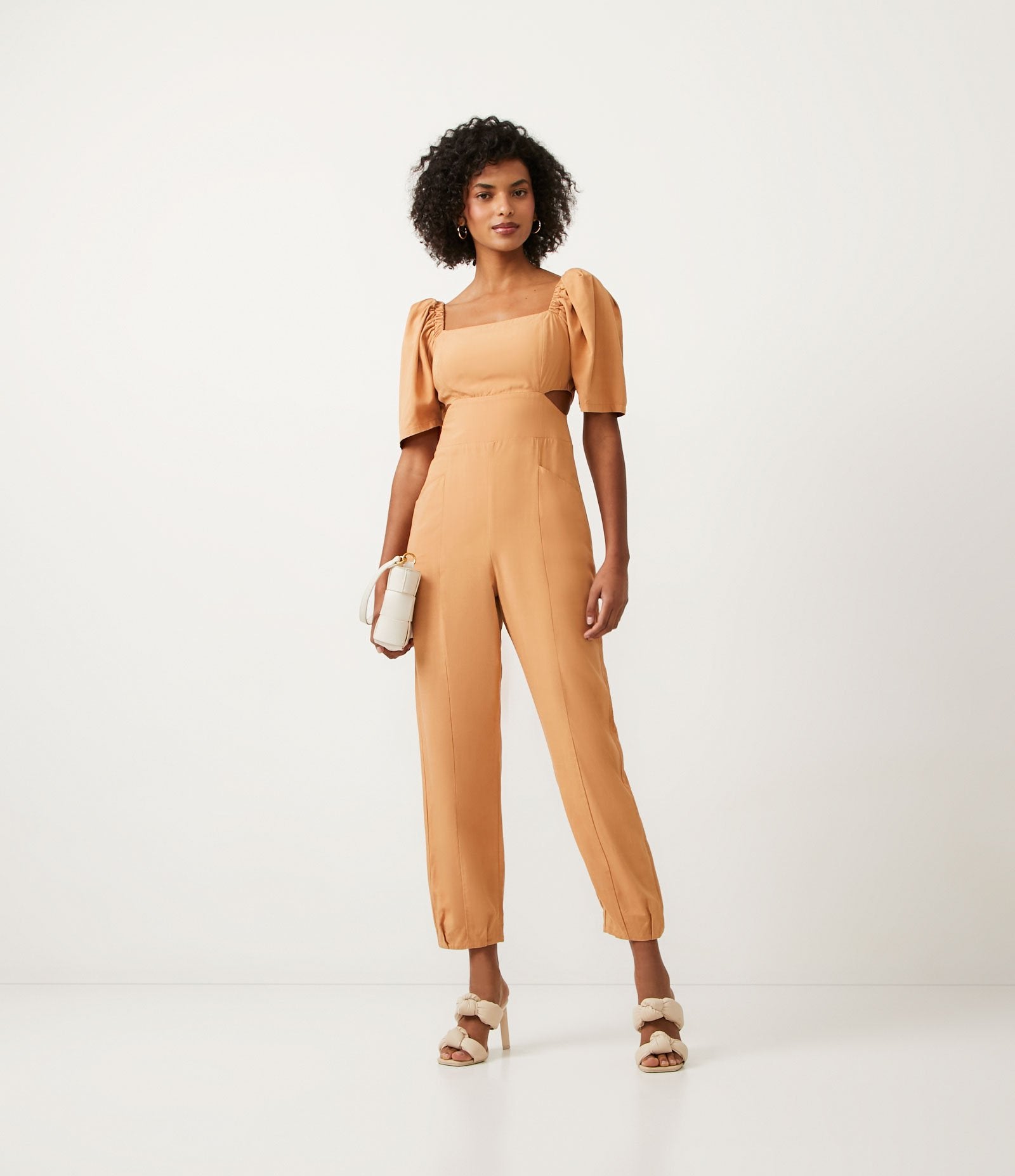 Macacão de viscose marrom com decote quadrado e mangas bufantes da Renner - Experimente a combinação perfeita de conforto, qualidade e estilo em cada peça.
