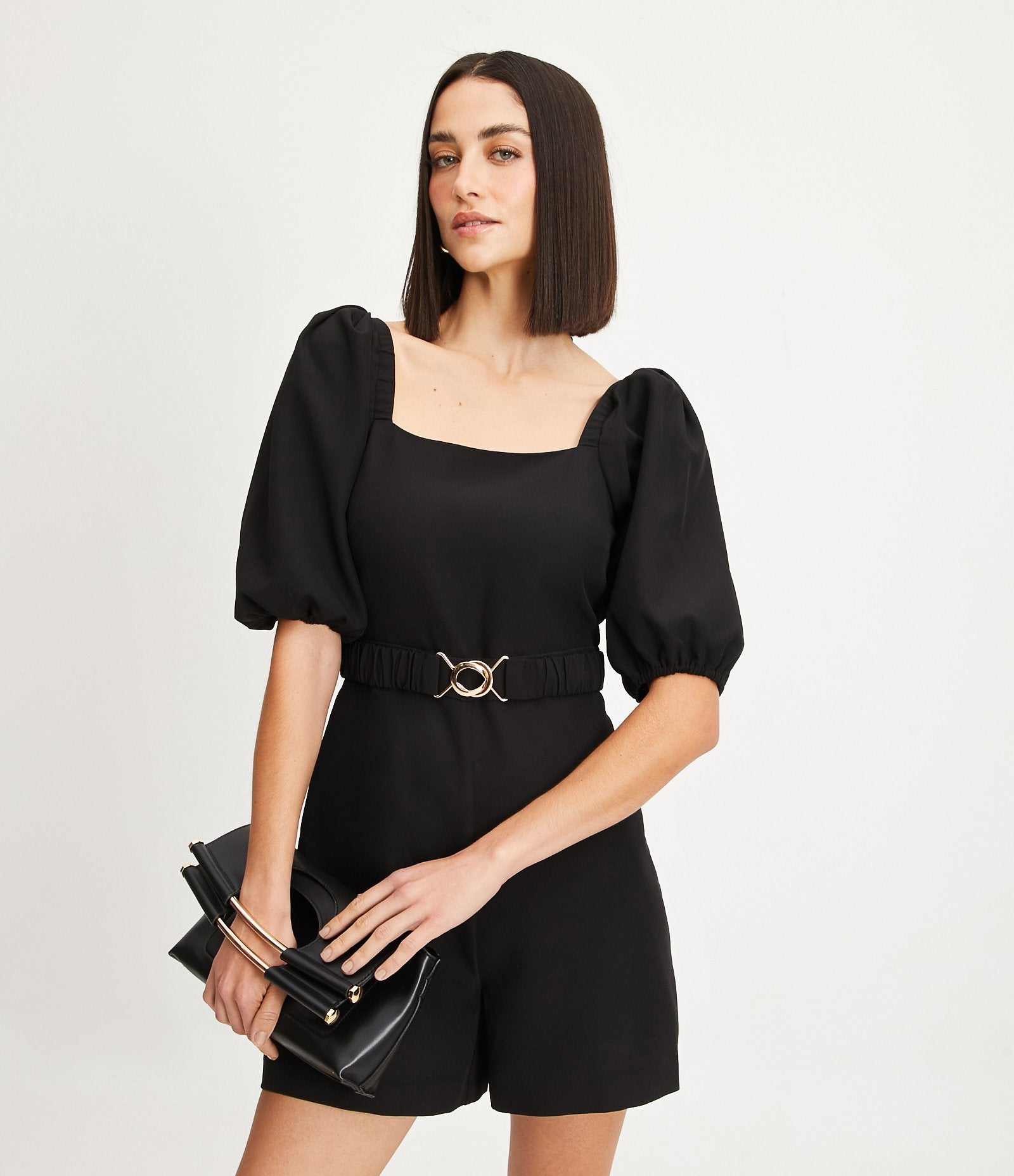 Romper de manga bufante em crepe com cinto elástico preto da Renner - Experimente a combinação perfeita de conforto, qualidade e estilo em cada peça.