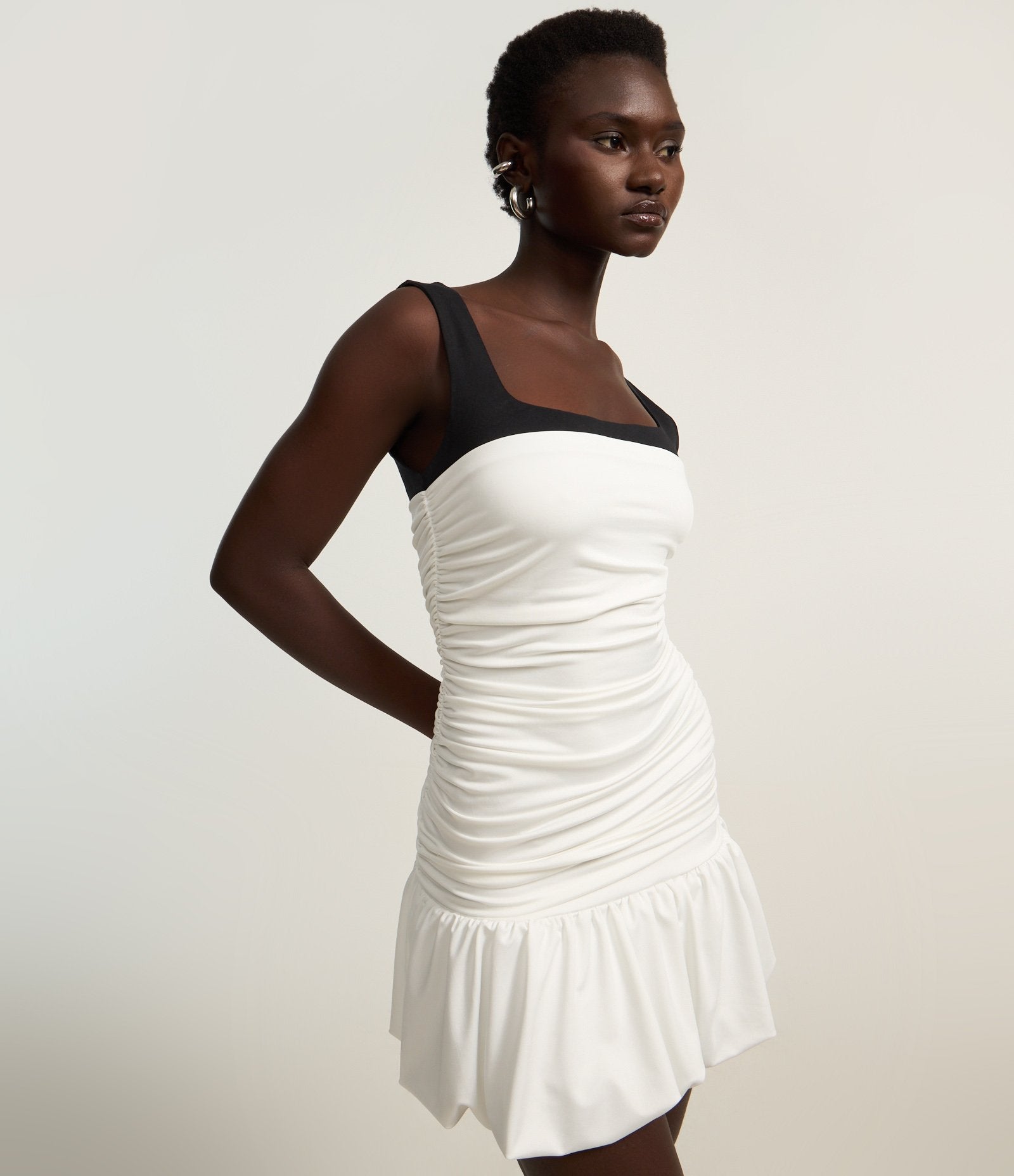 Vestido curto com bolhas em Helanca com design drapeado e alça branca contrastante