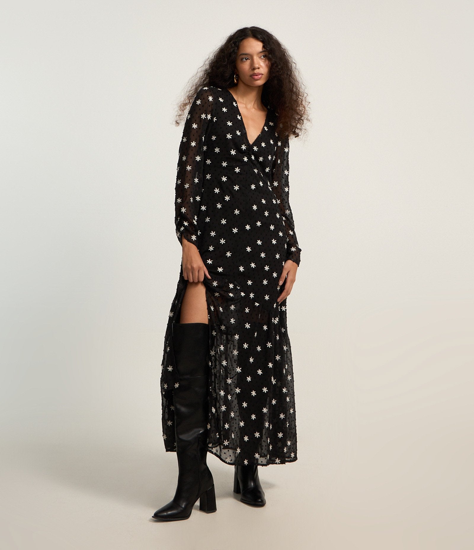 Vestido Longo Linha A em Chiffon com Bordado Floral Preto da Renner - Experimente o conforto, a qualidade e o estilo em cada peça.