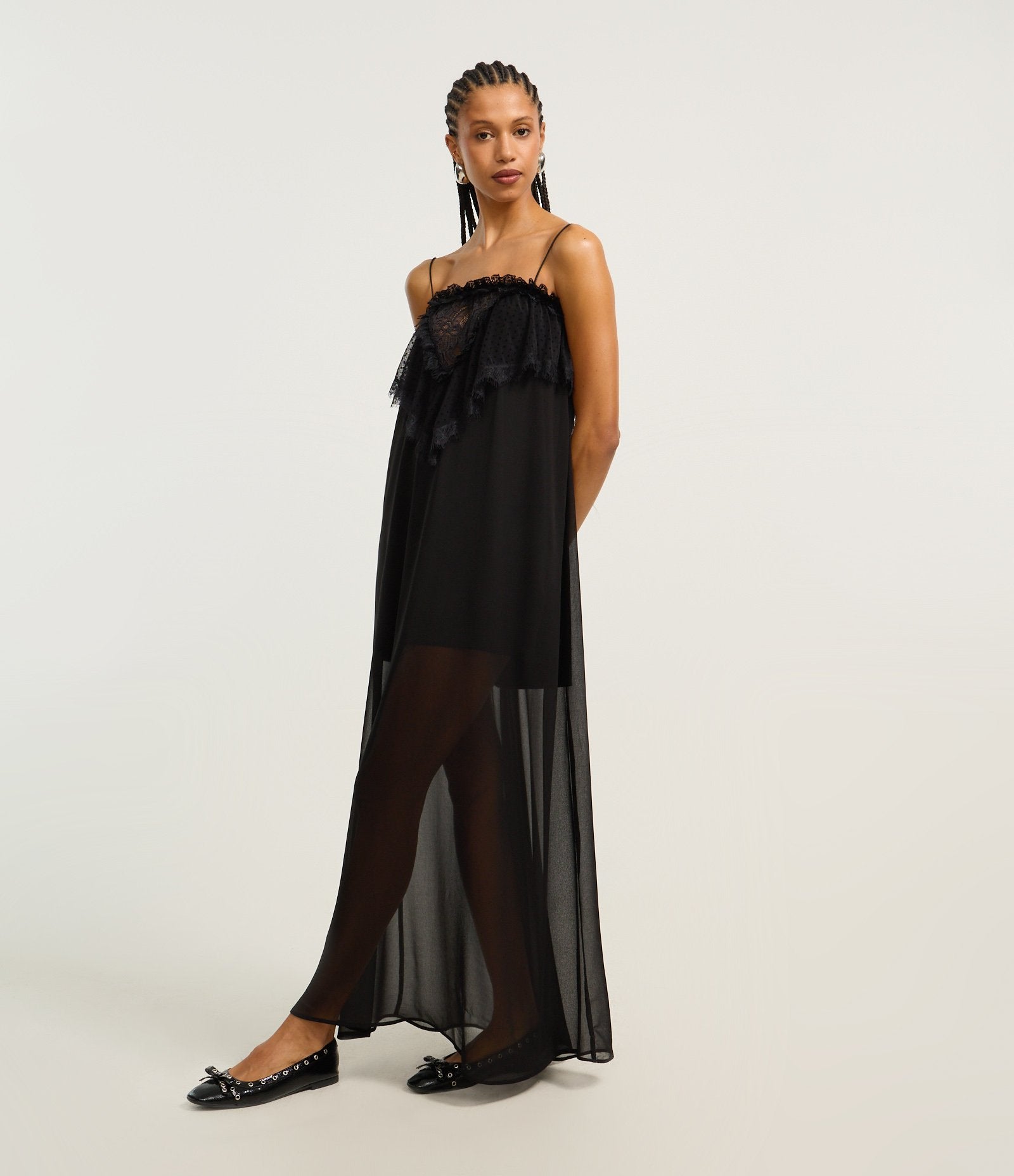 Vestido longo de renda preta com babados e detalhes transparentes da Renner - Experimente a combinação perfeita de conforto, qualidade e estilo em cada peça.