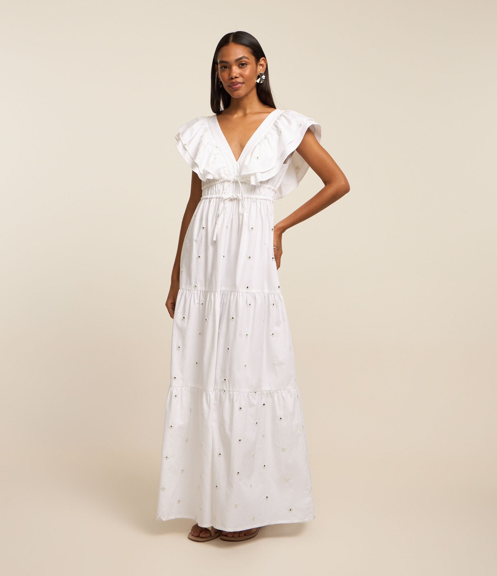 Vestido Tricoline sem mangas com babado no ombro branco da Renner - Experimente a combinação perfeita de conforto, qualidade e estilo em cada peça.