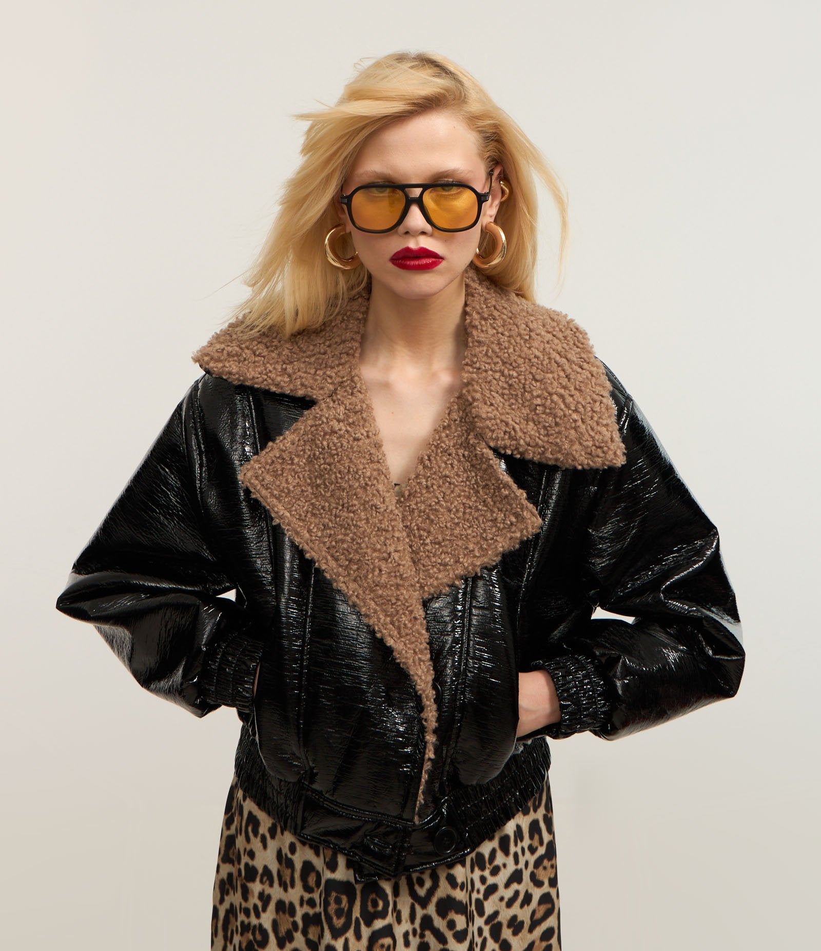 Jaqueta Biker de Couro Sintético Preto com Acabamento Brilhante e Detalhe em Pelo Sintético