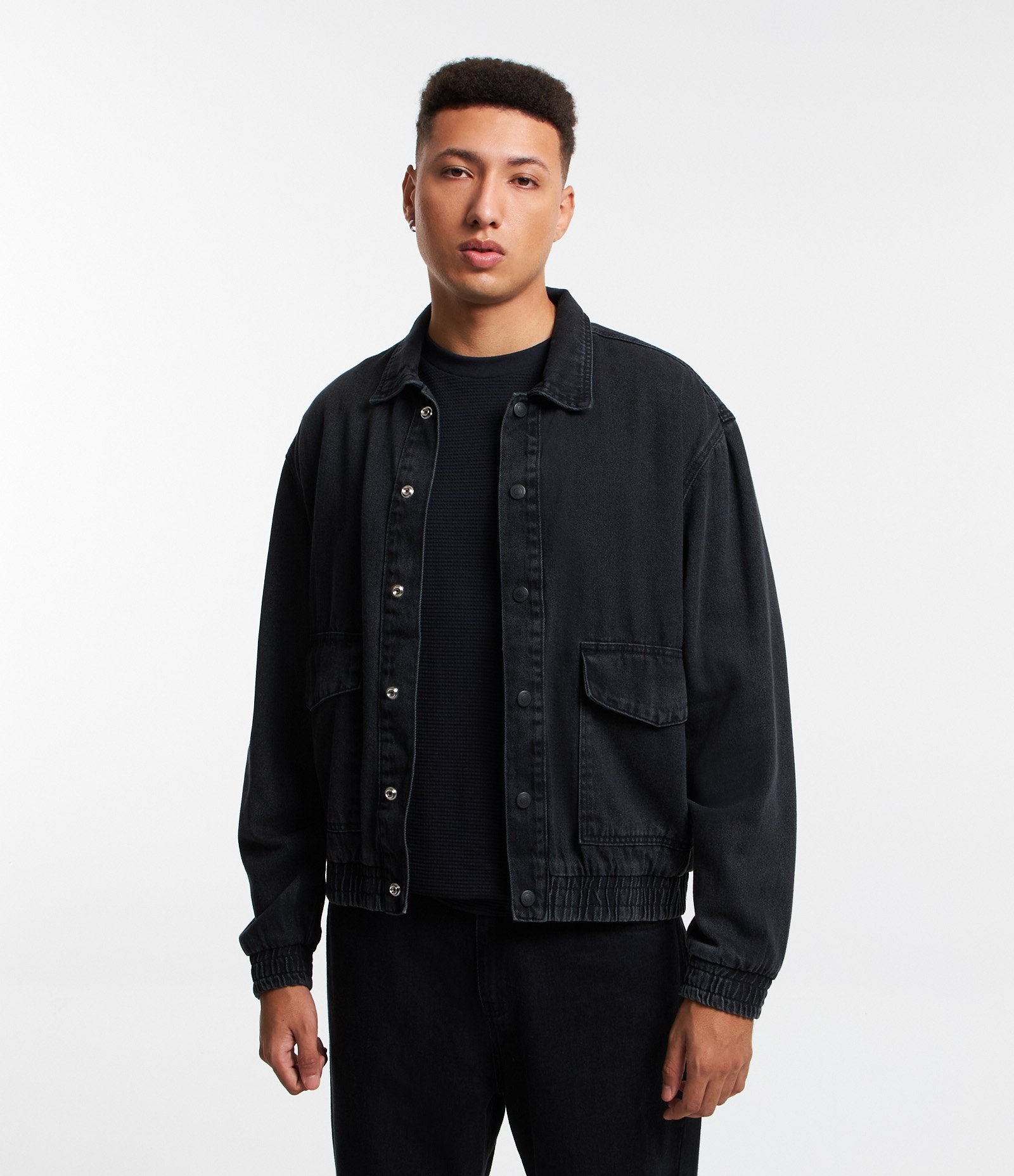Jaqueta Bomber de brim preta com bolsos frontais