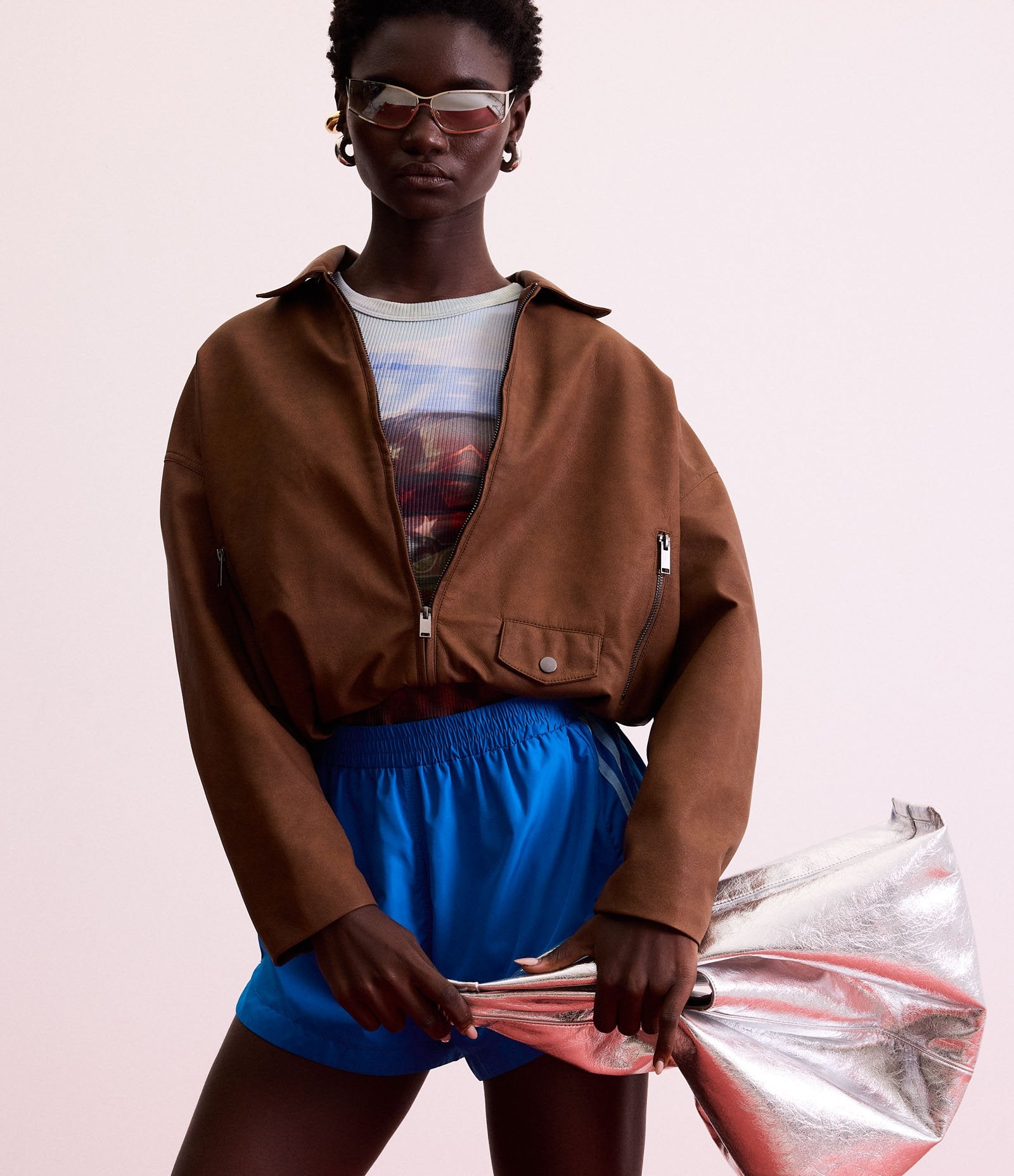 Jaqueta Bomber Marrom em PU com Bolsos com Zíper