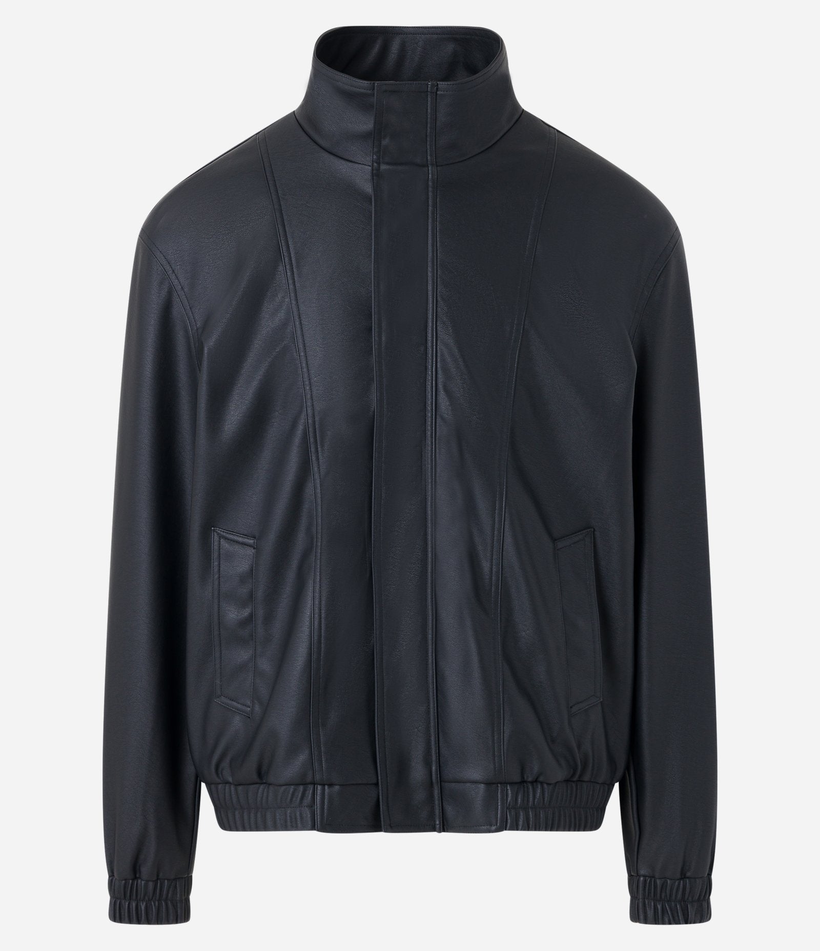 Jaqueta Bomber PU preta de gola alta com zíper e bolsos