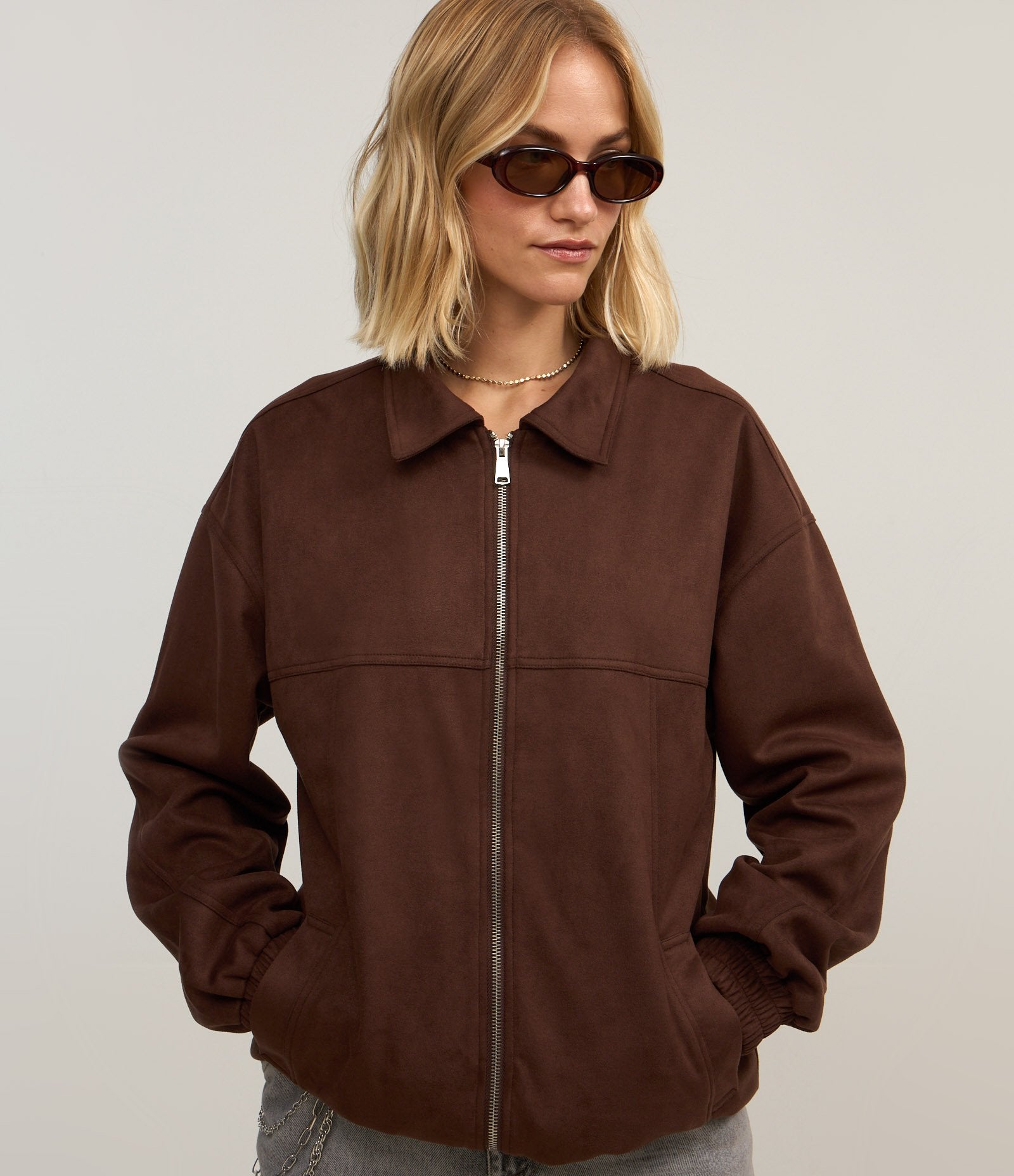 Jaqueta Bomber de Suedine Marrom com Zíper Frontal