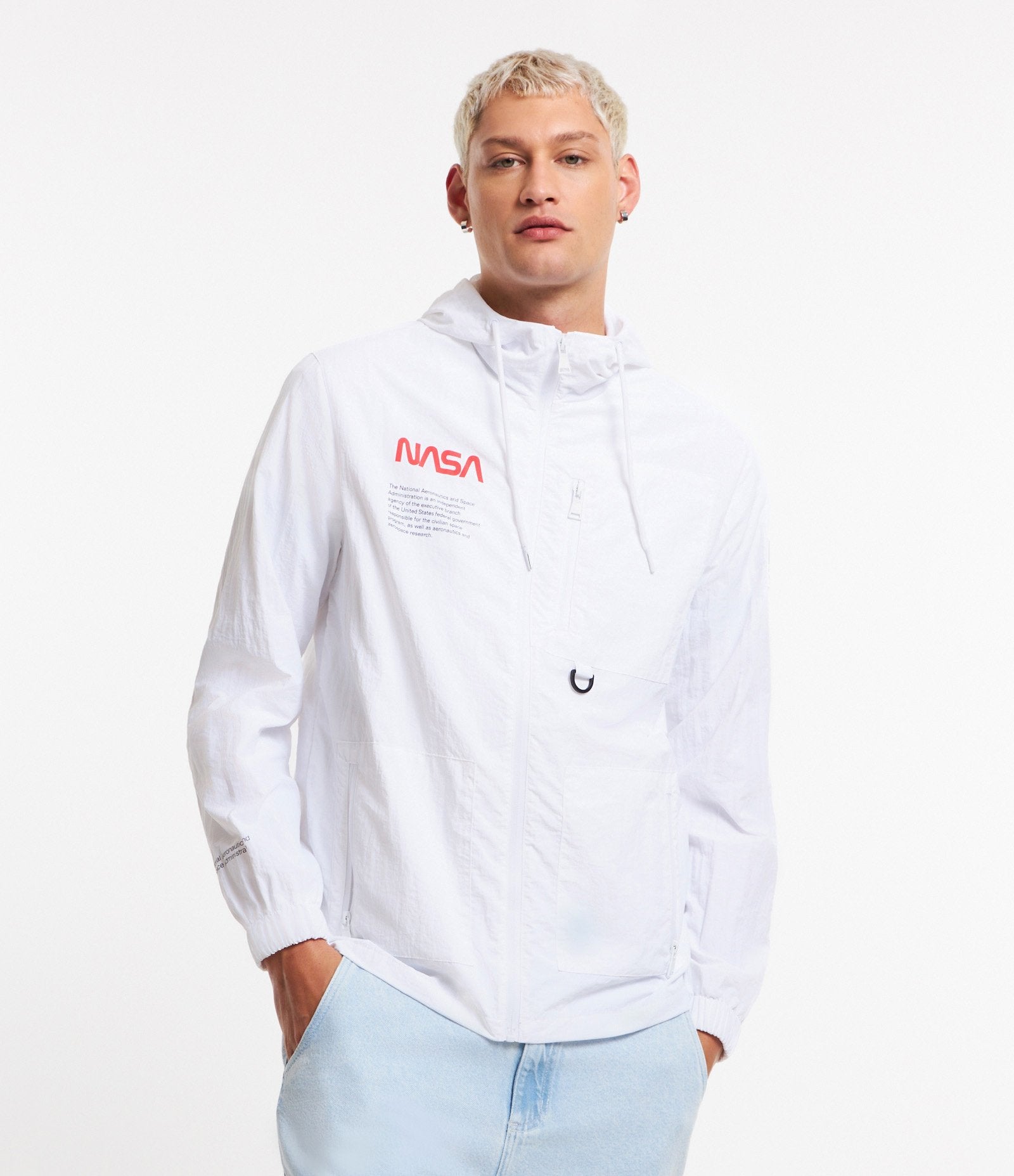 Jaqueta branca com capuz com estampa da NASA e bandeira aplicada em poliamida